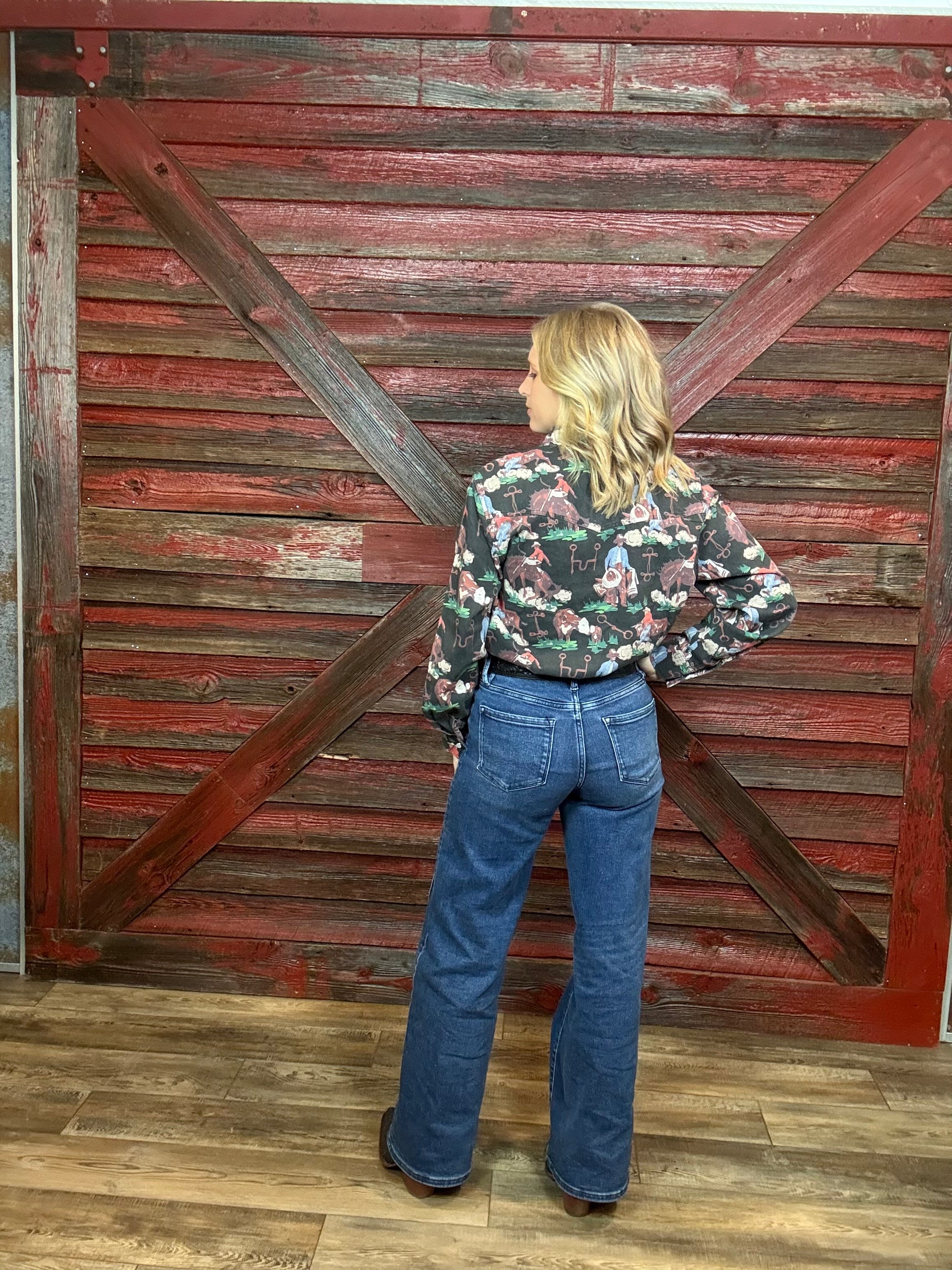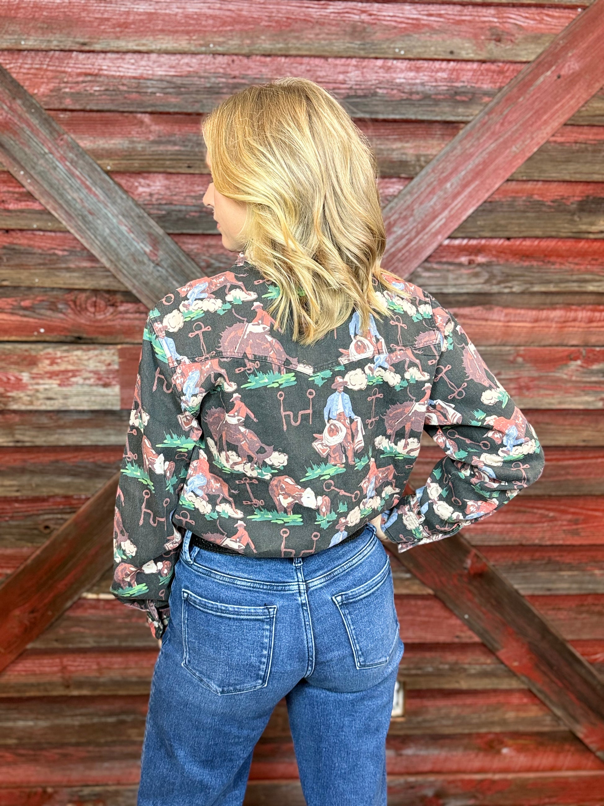 Black Denim Pearl Snap with Green accents. The greatest vintage cowboy print in the game.