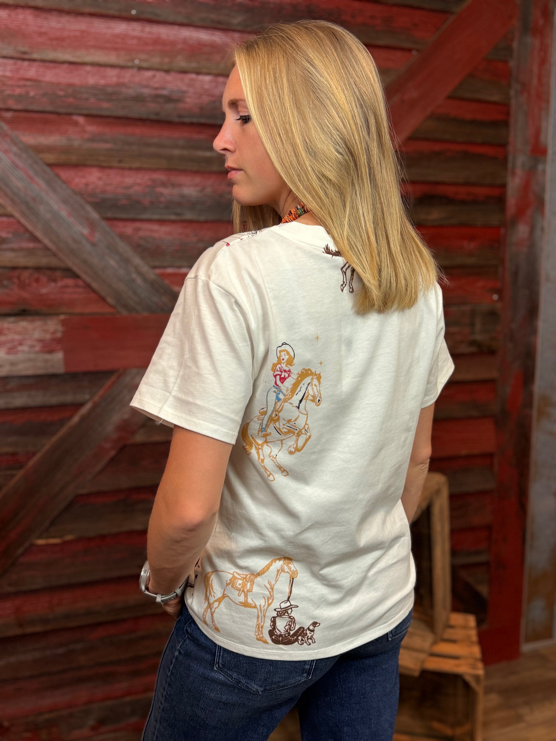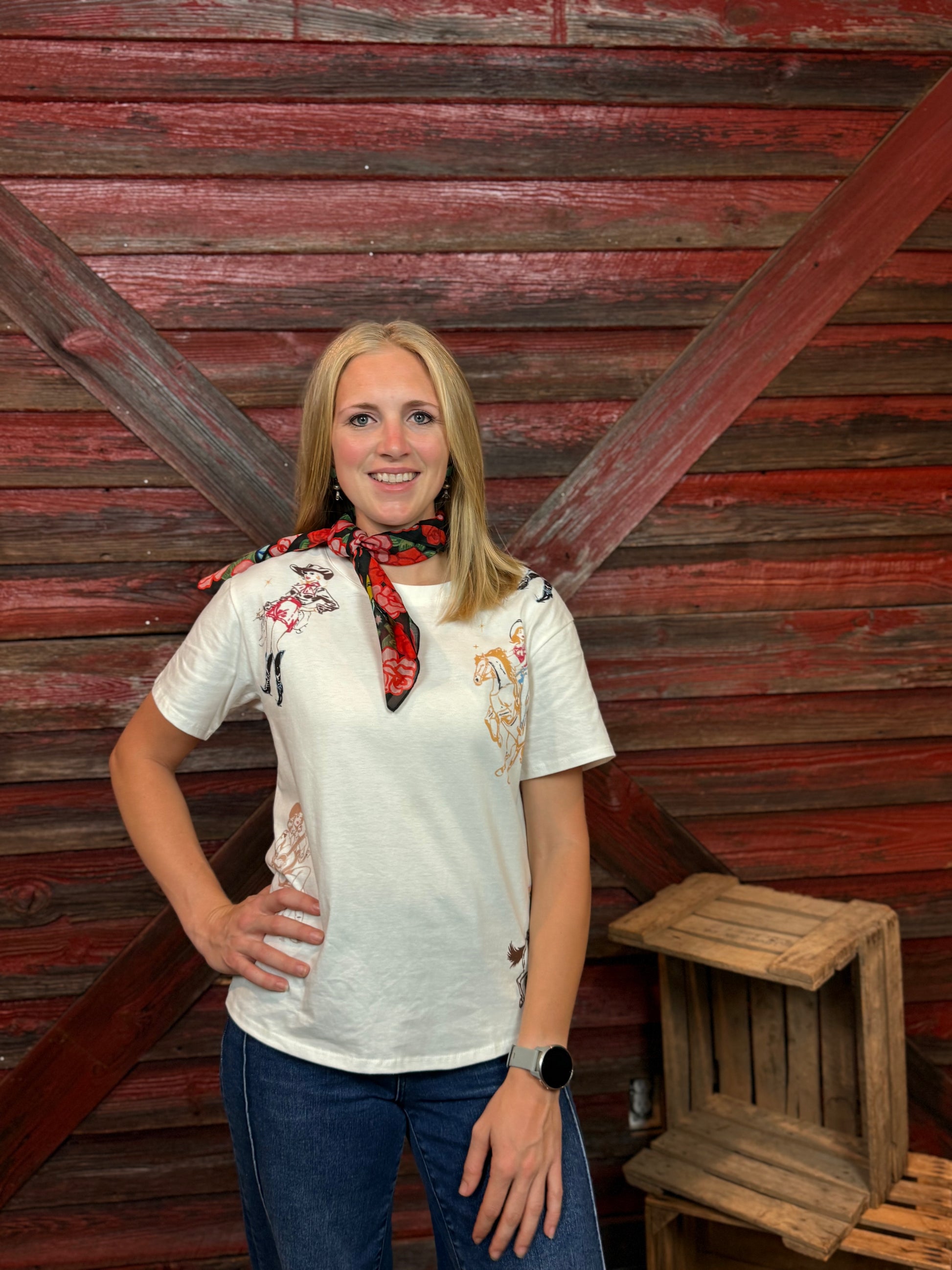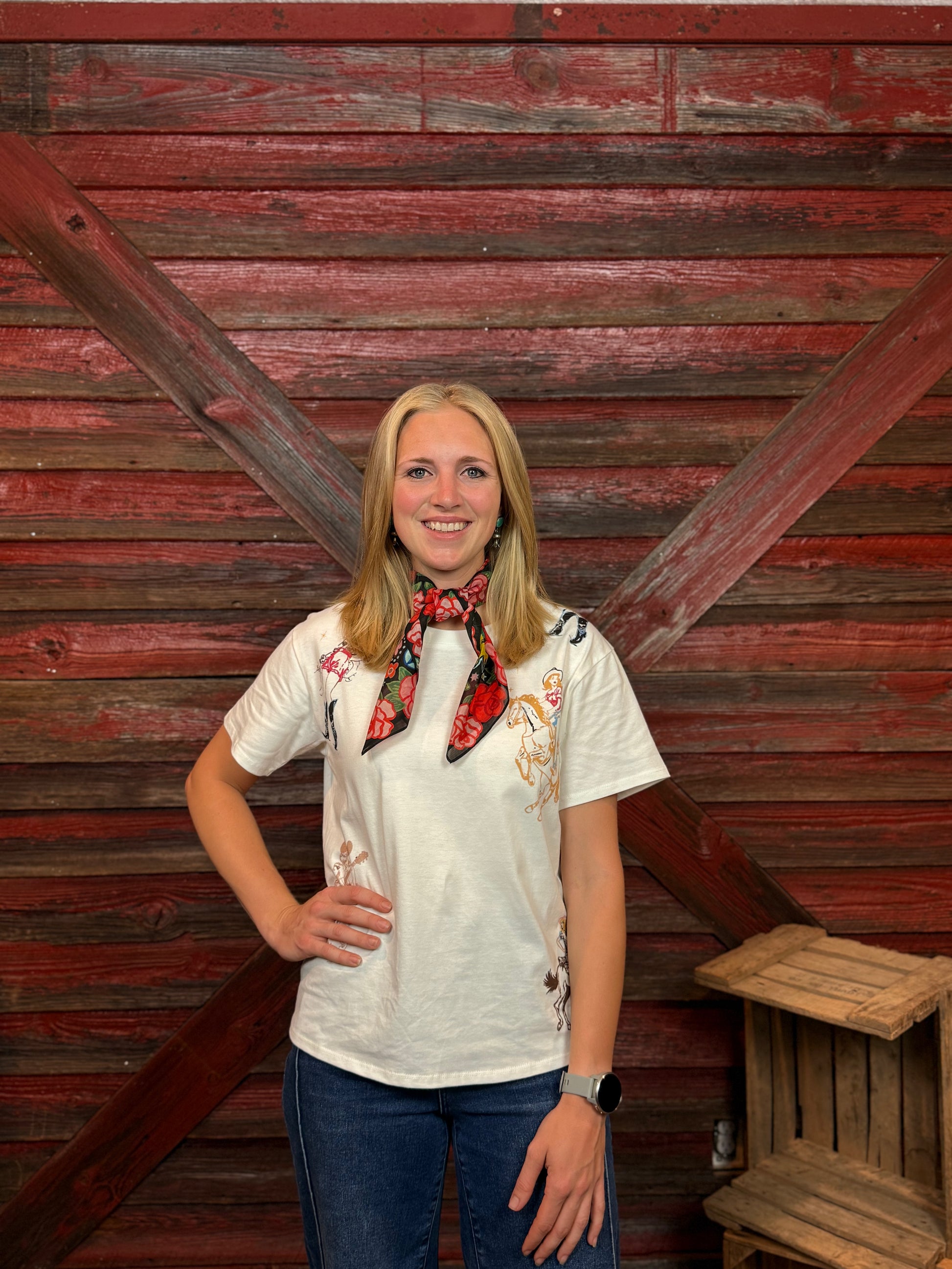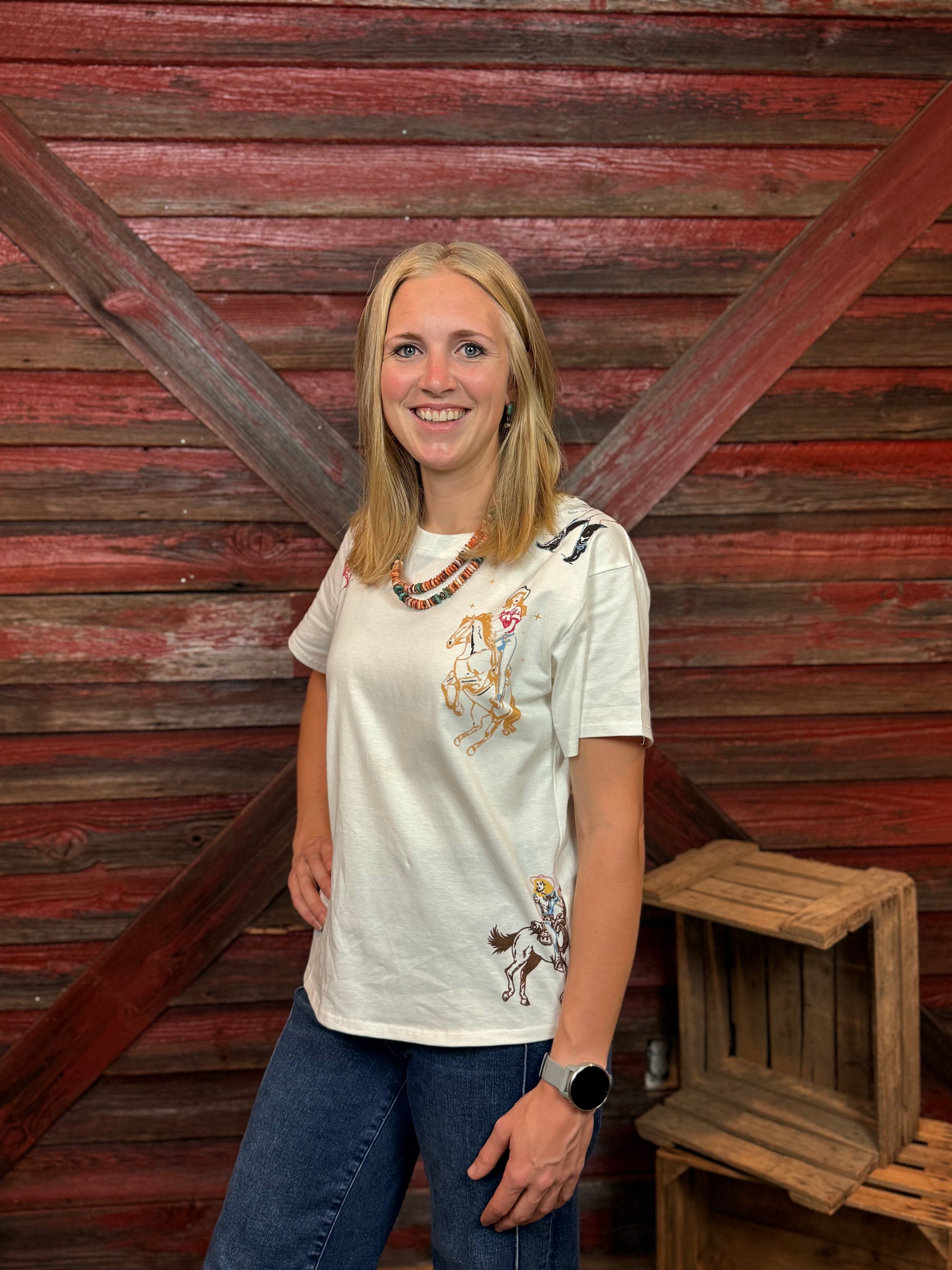 A graphic tee with bold colored western motifs. Colorful and easy to pair with accessories of your choosing.