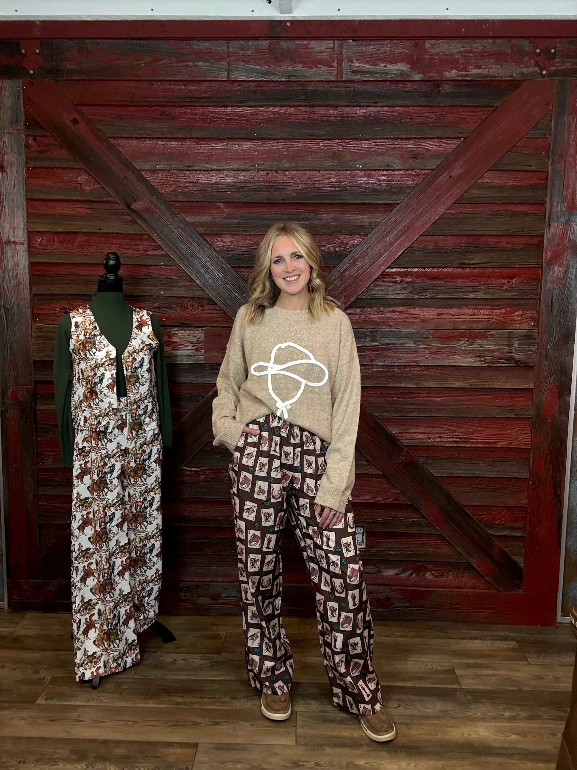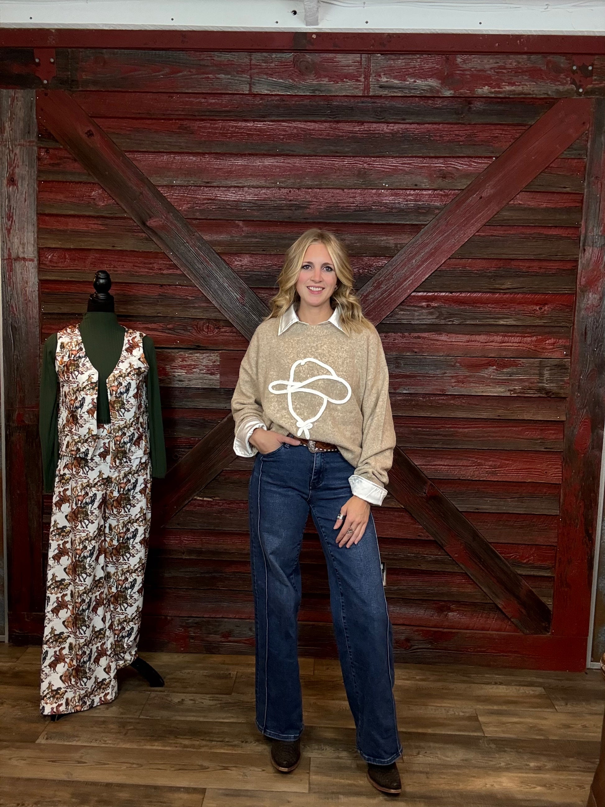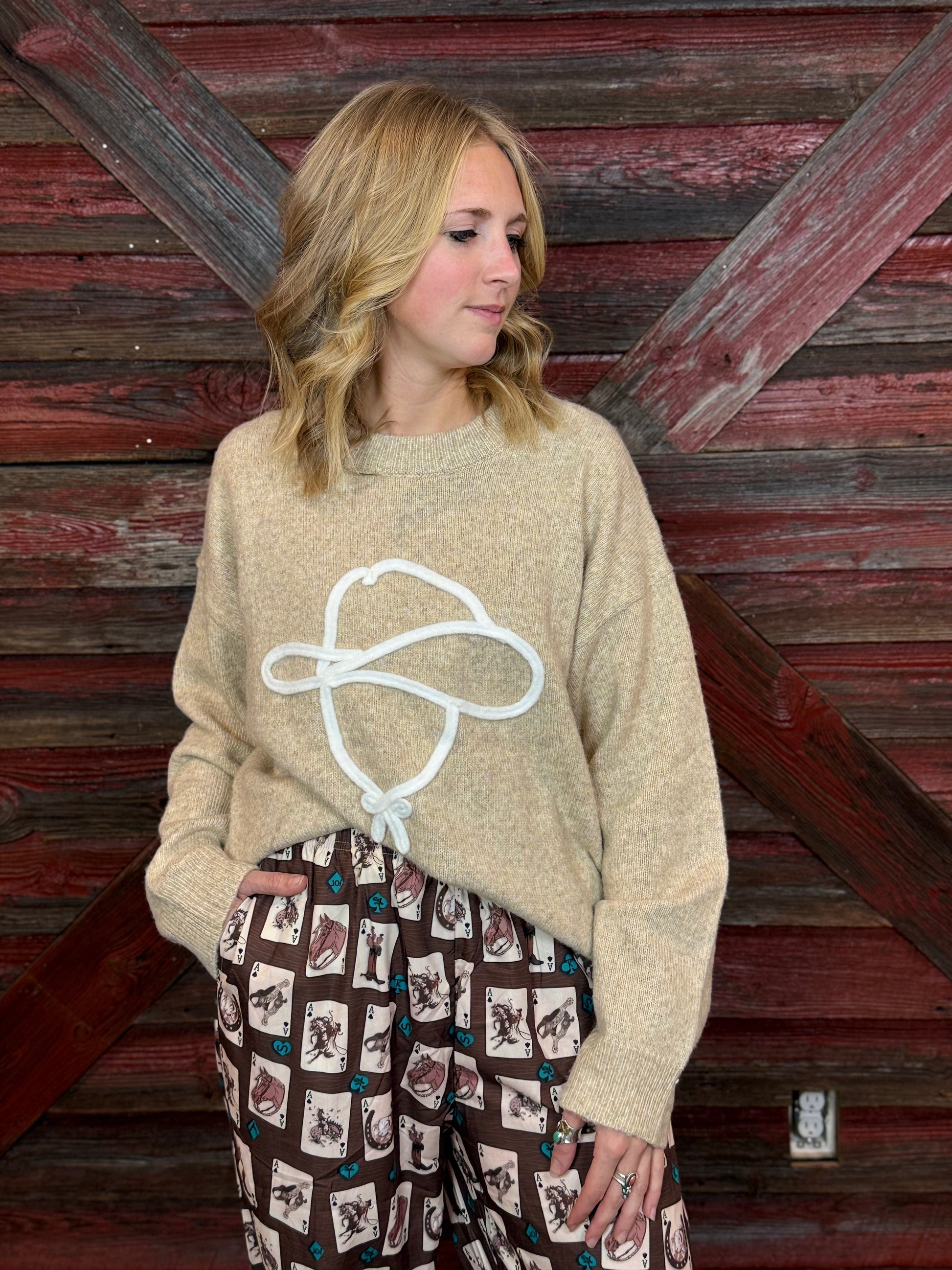 Oatmeal Sweater with White Cowboy Head Outline
