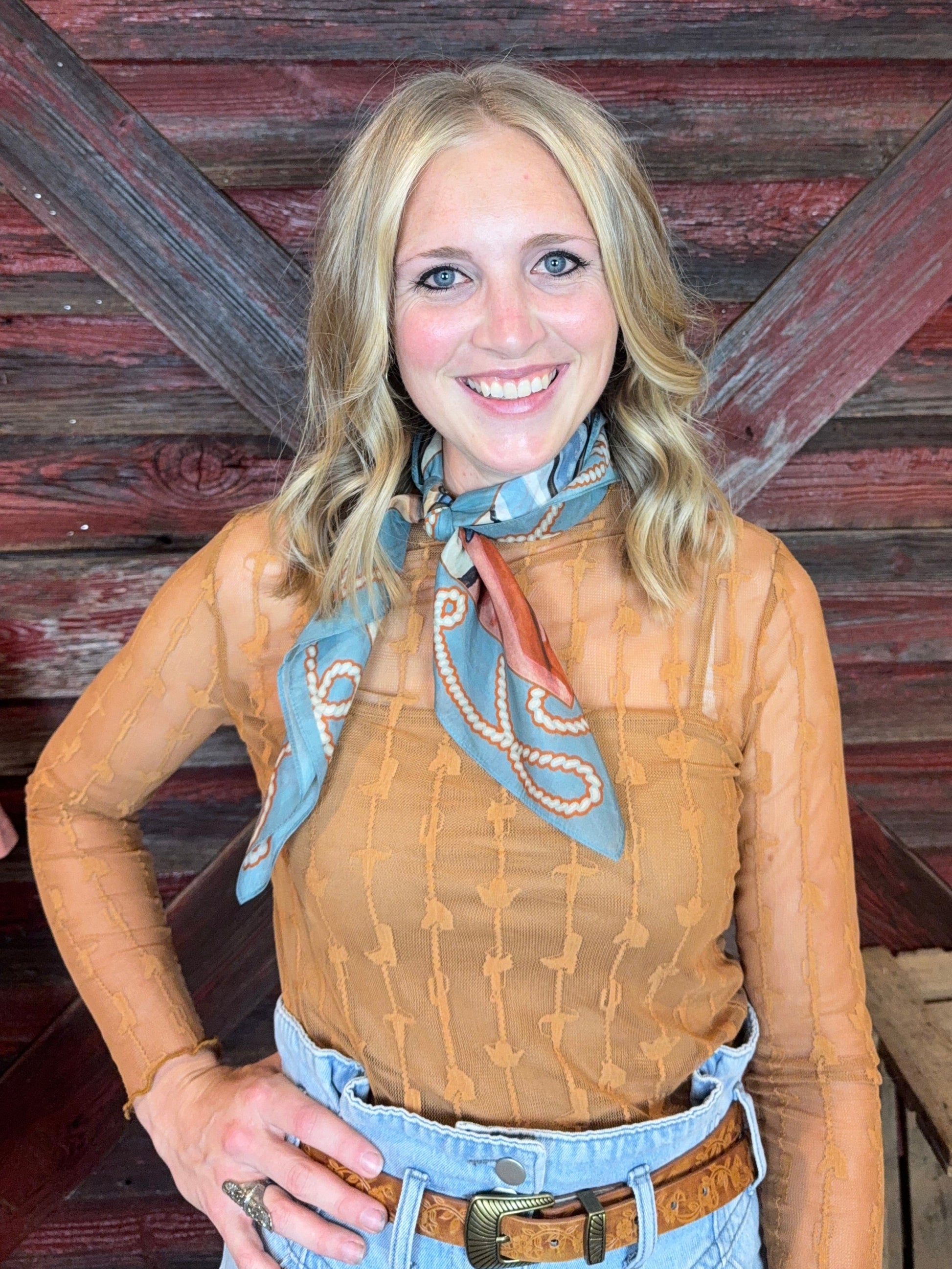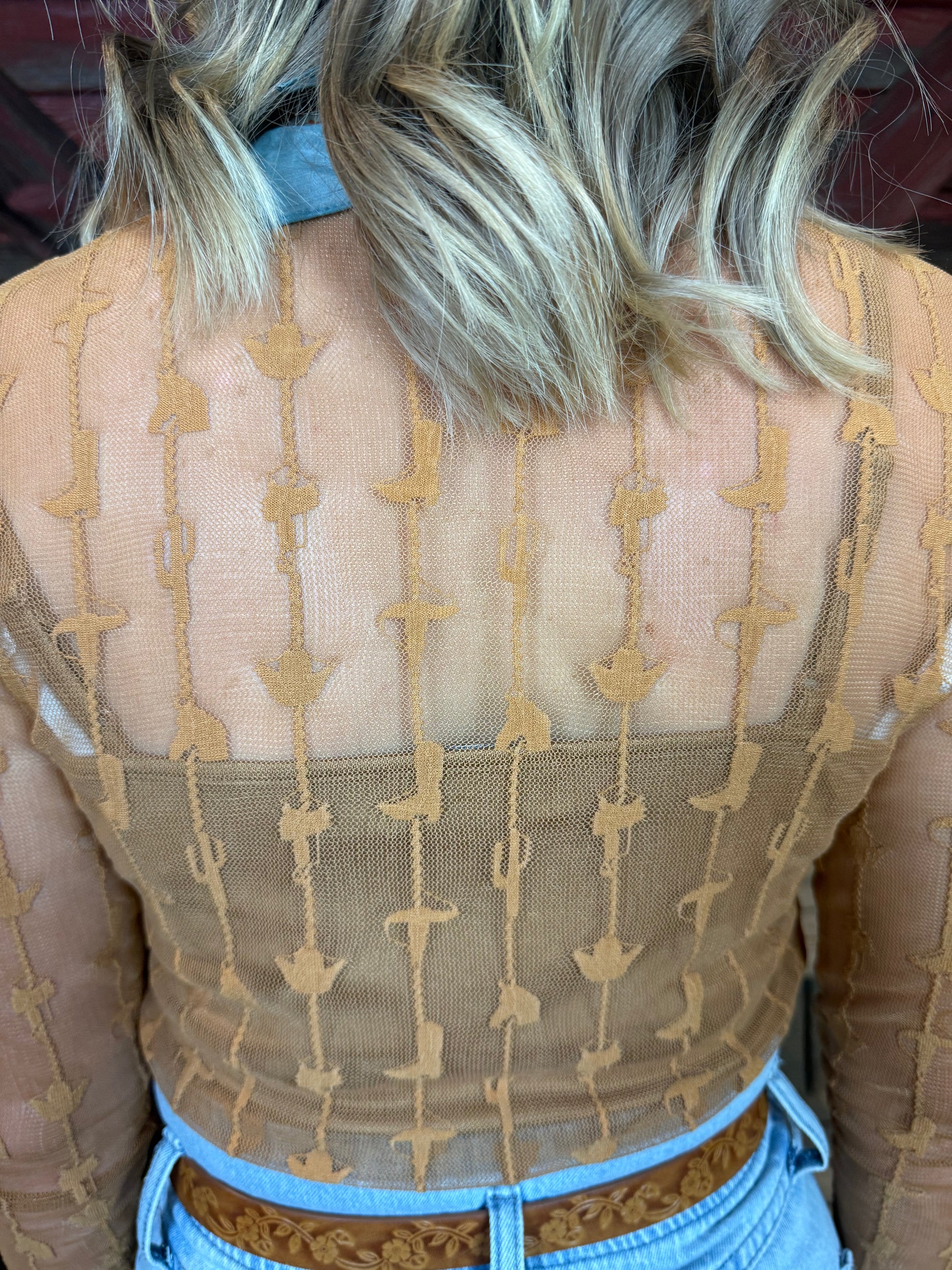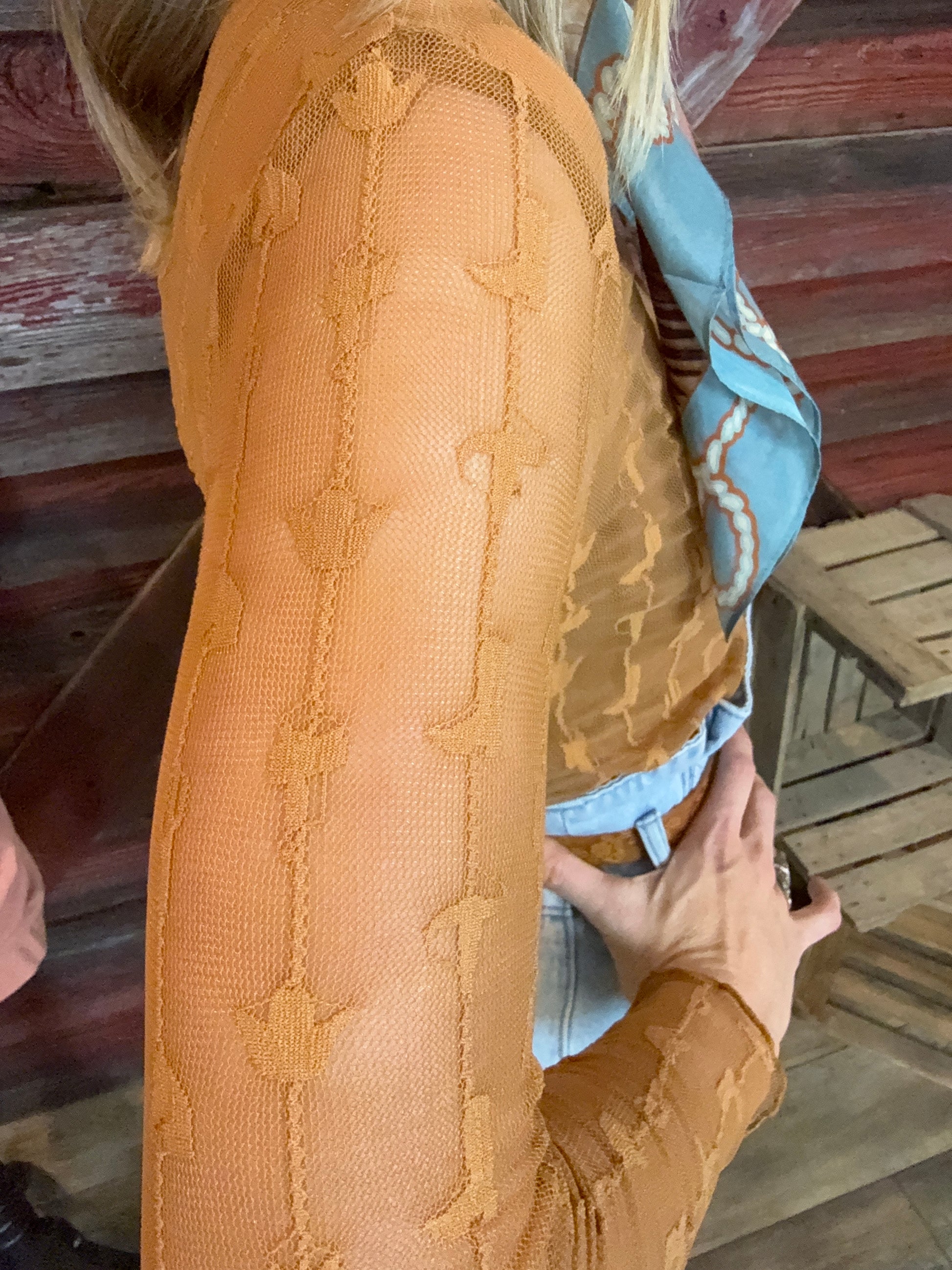 Mesh Long Sleeve. Saddle brown in color. Western themed stitching (boots, hats, saddles).