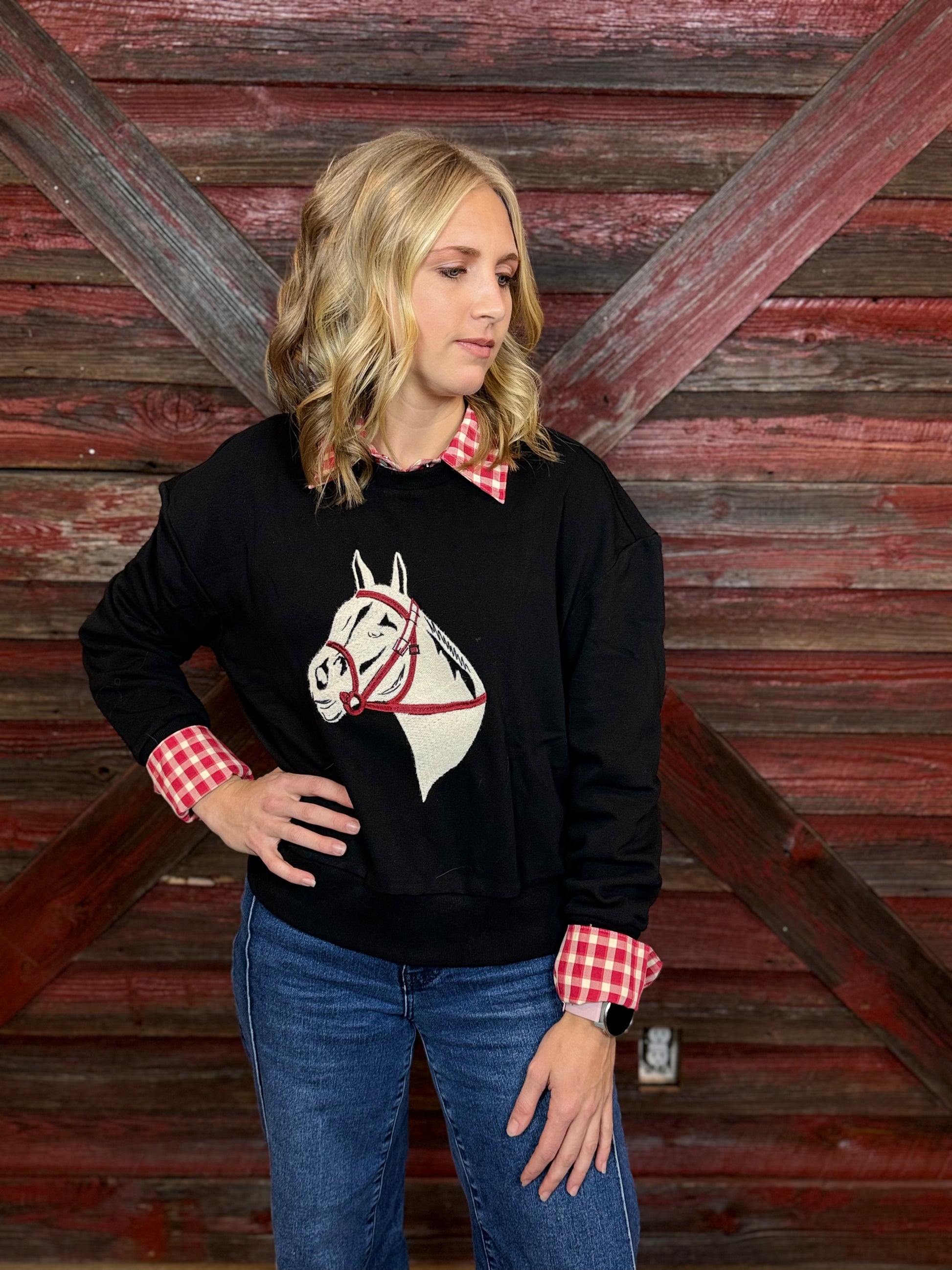 Your newest favorite black crewneck. The horse head brings equestrian personality to the comfy cute that is this top.