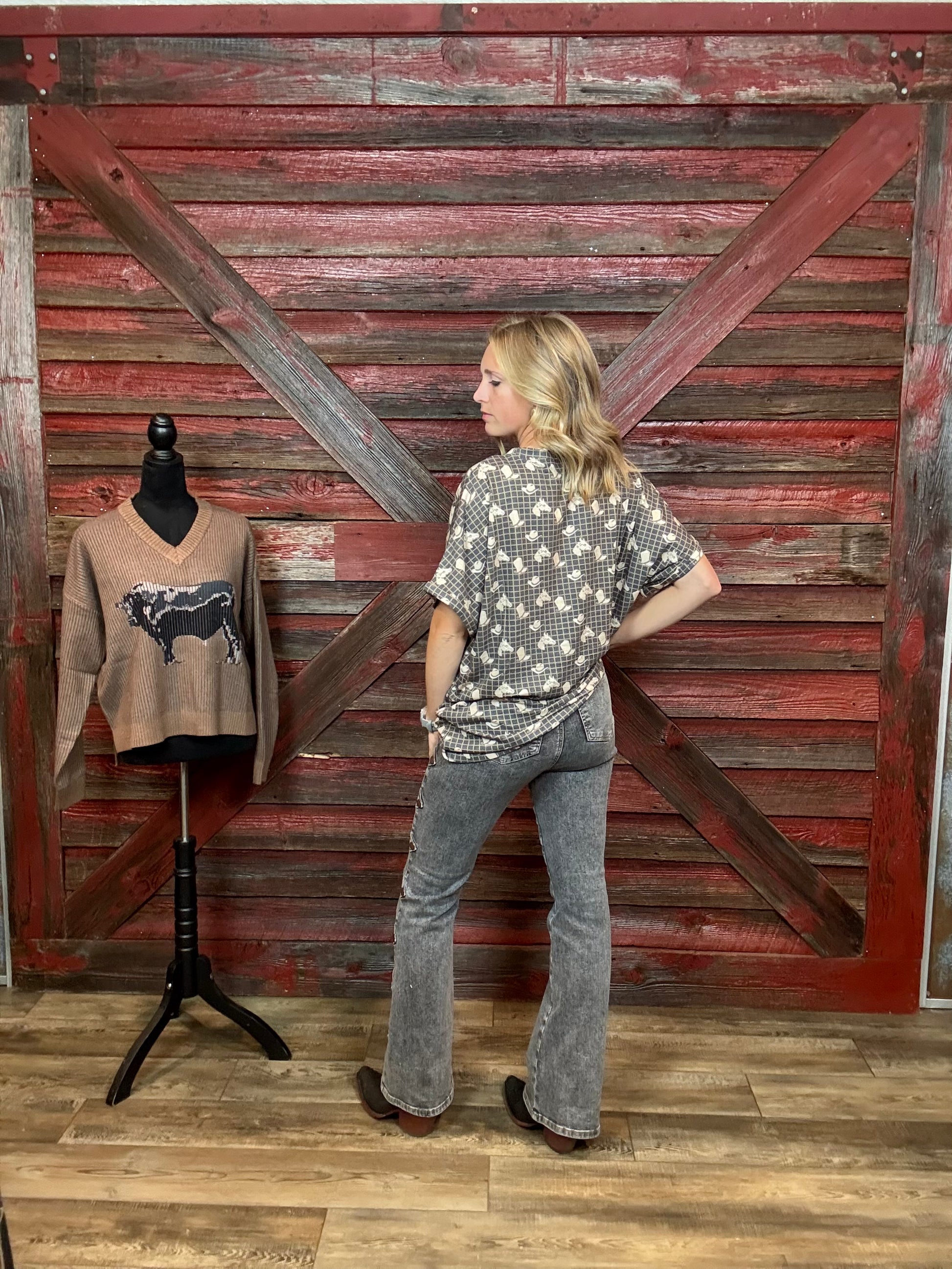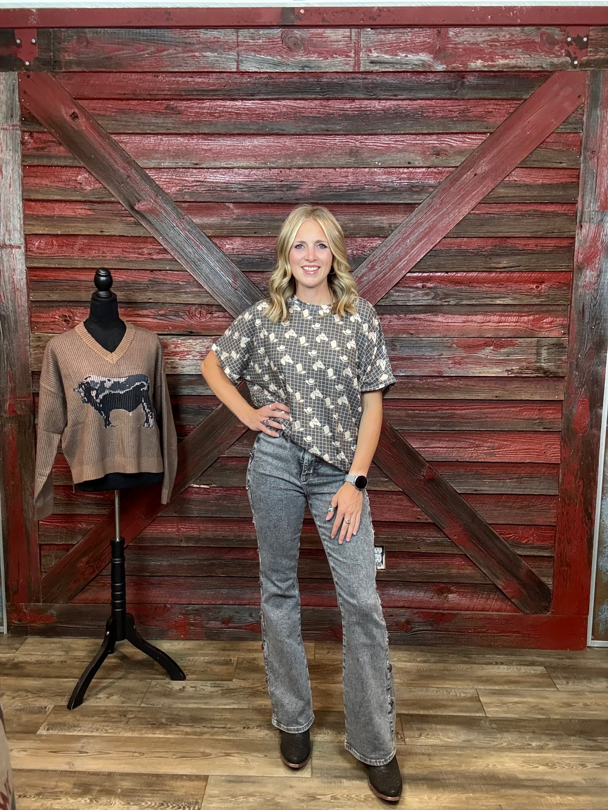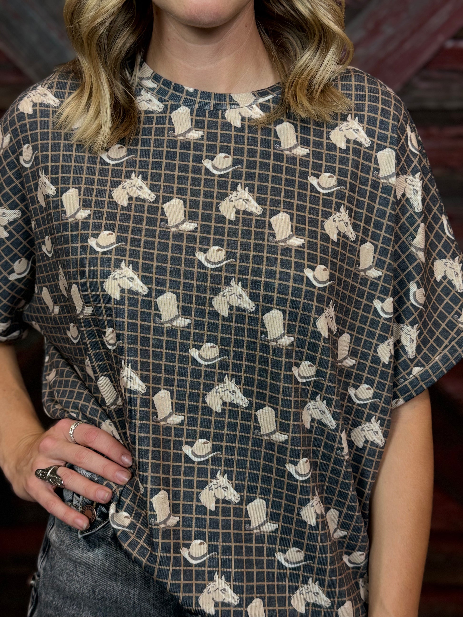 Neutral Printed Grid with horse heads, boots, and cowboy hats