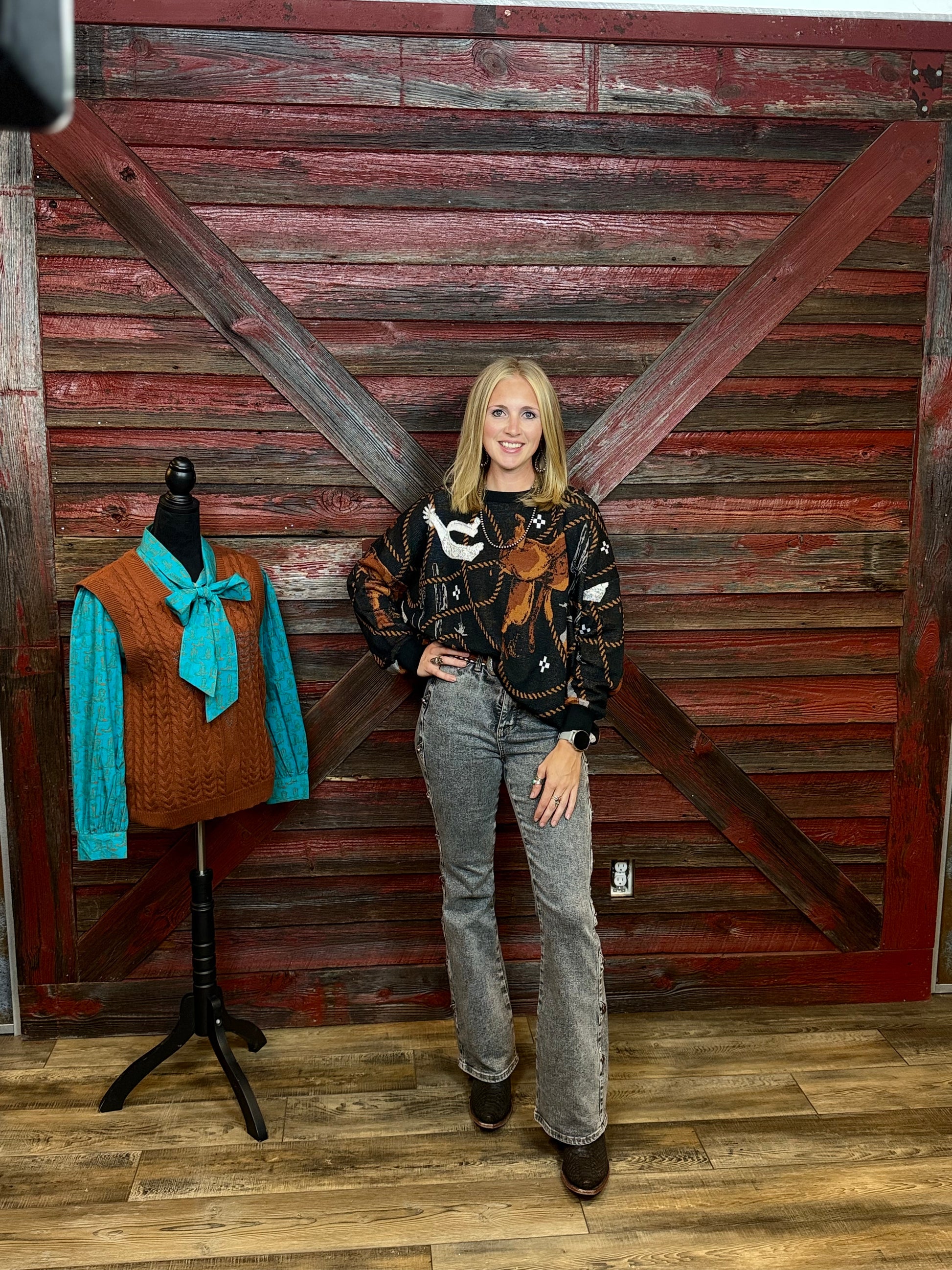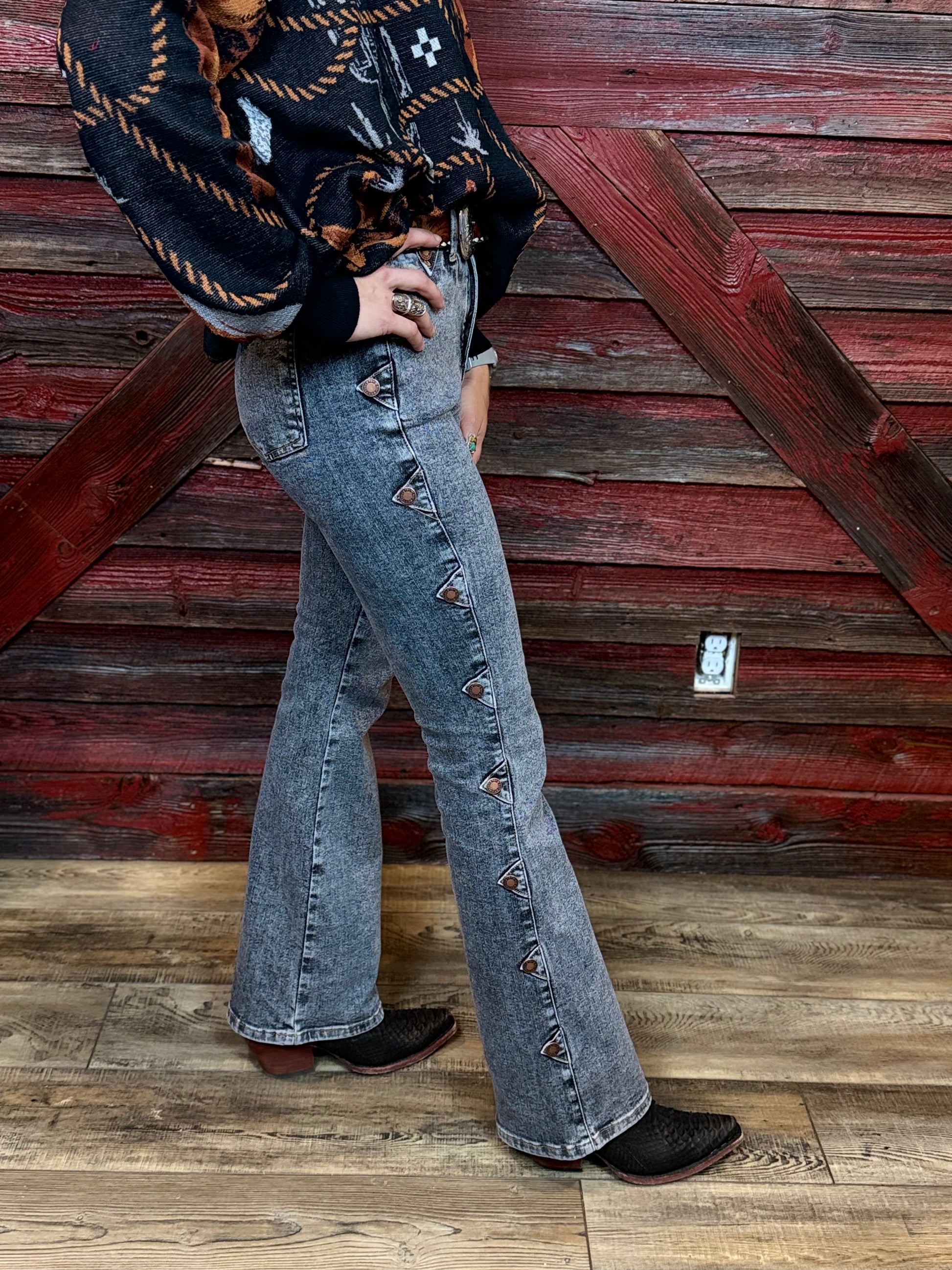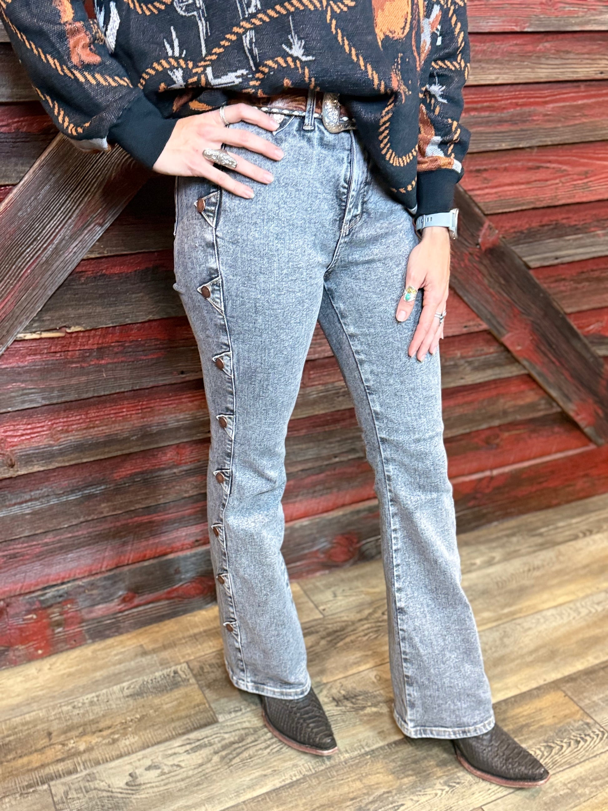 Grey Wash Denim with Retro Western side seam including bronze buttons