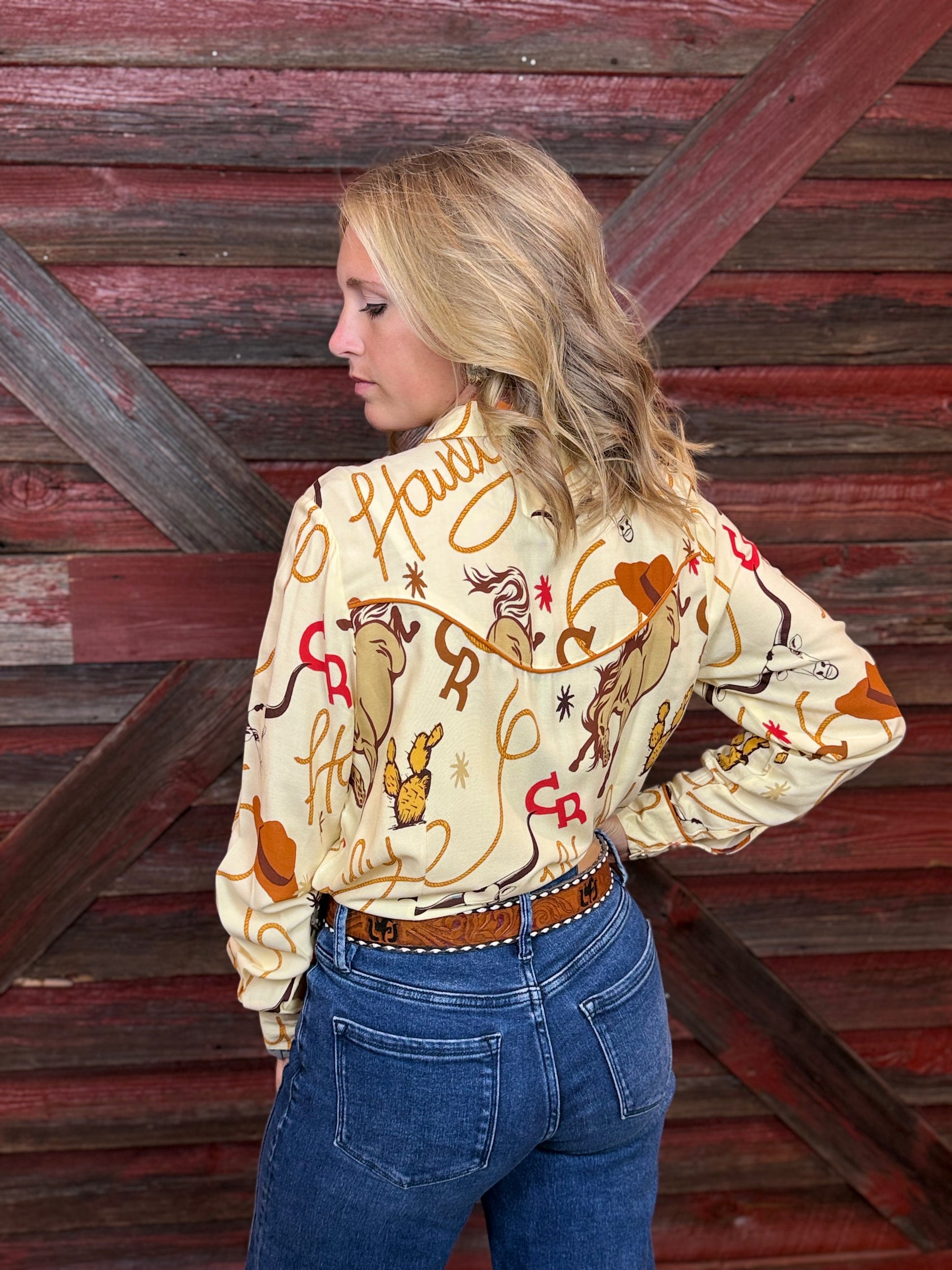 Cream Pearl Snap Blouse with Bold Western Motif Pattern with Pops of Yellows & Reds