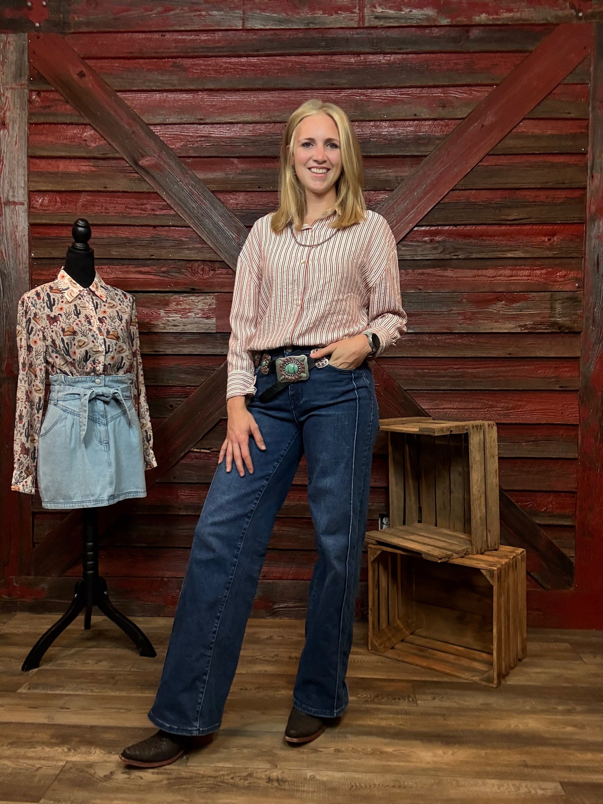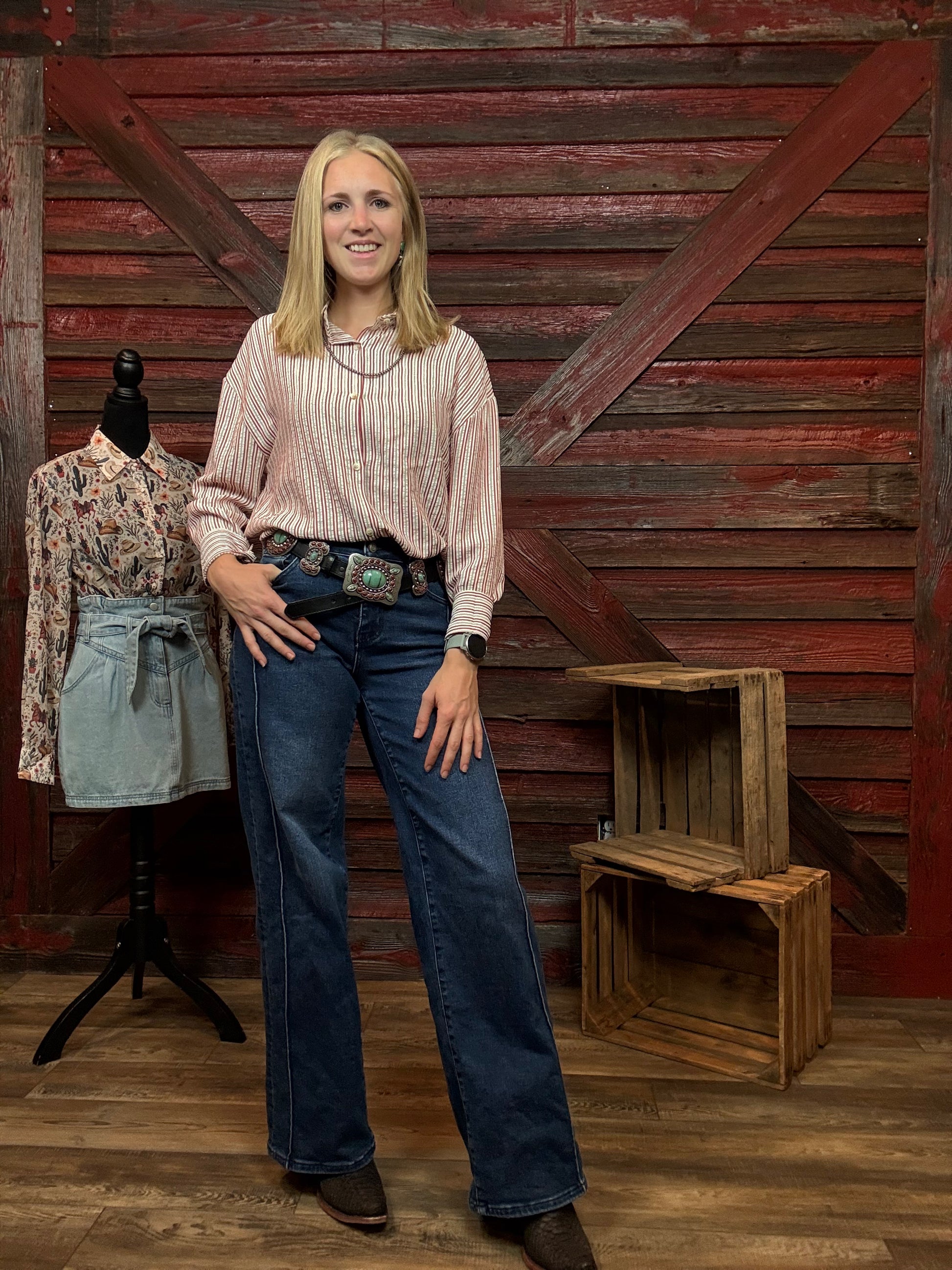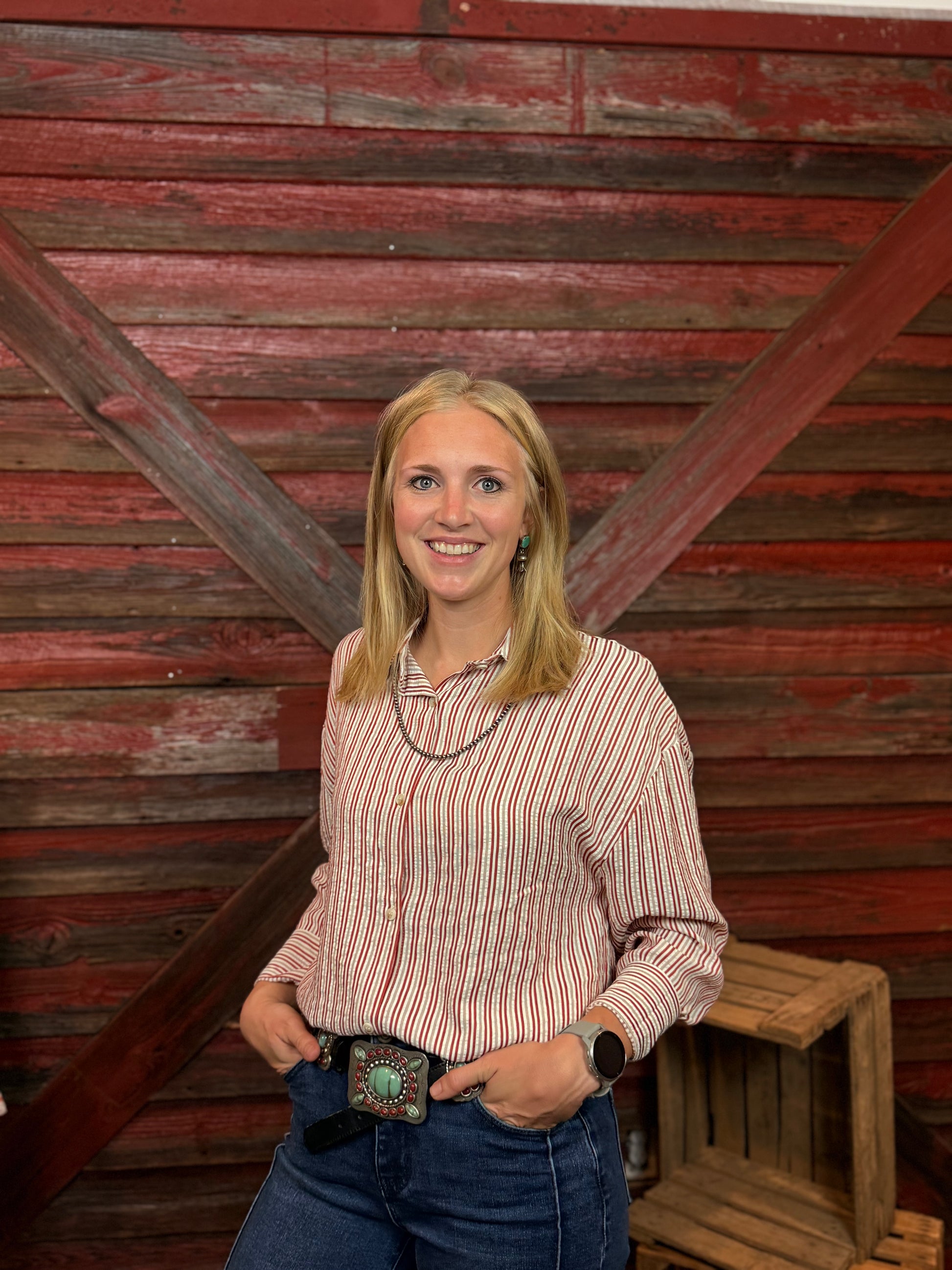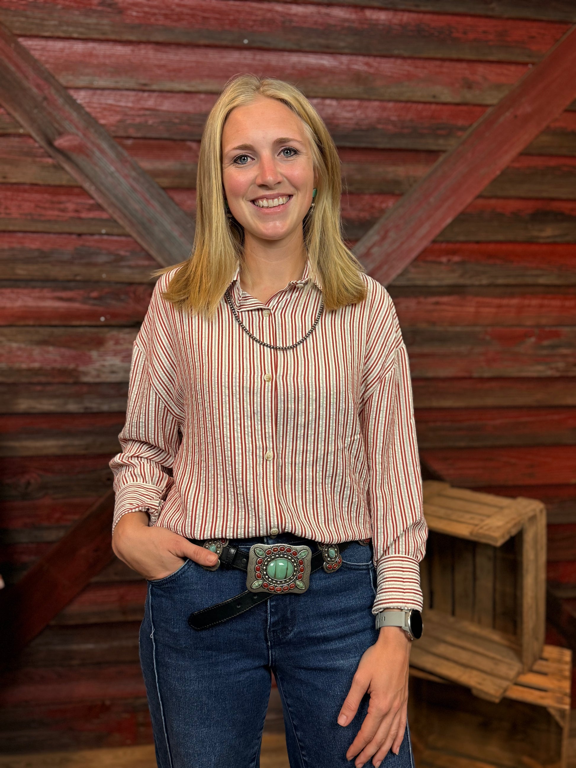 A classic red striped button up. Great for office wear, or cowgirls looking to add a little western flare. Lightweight, transitional piece.