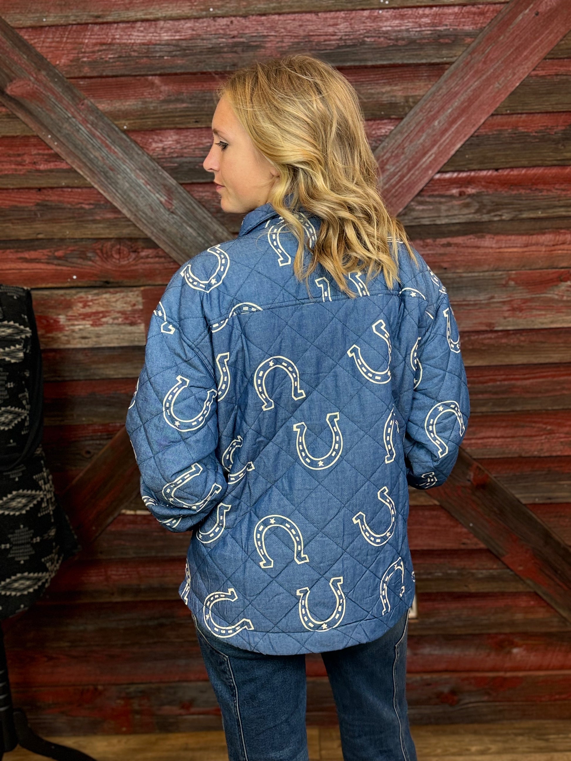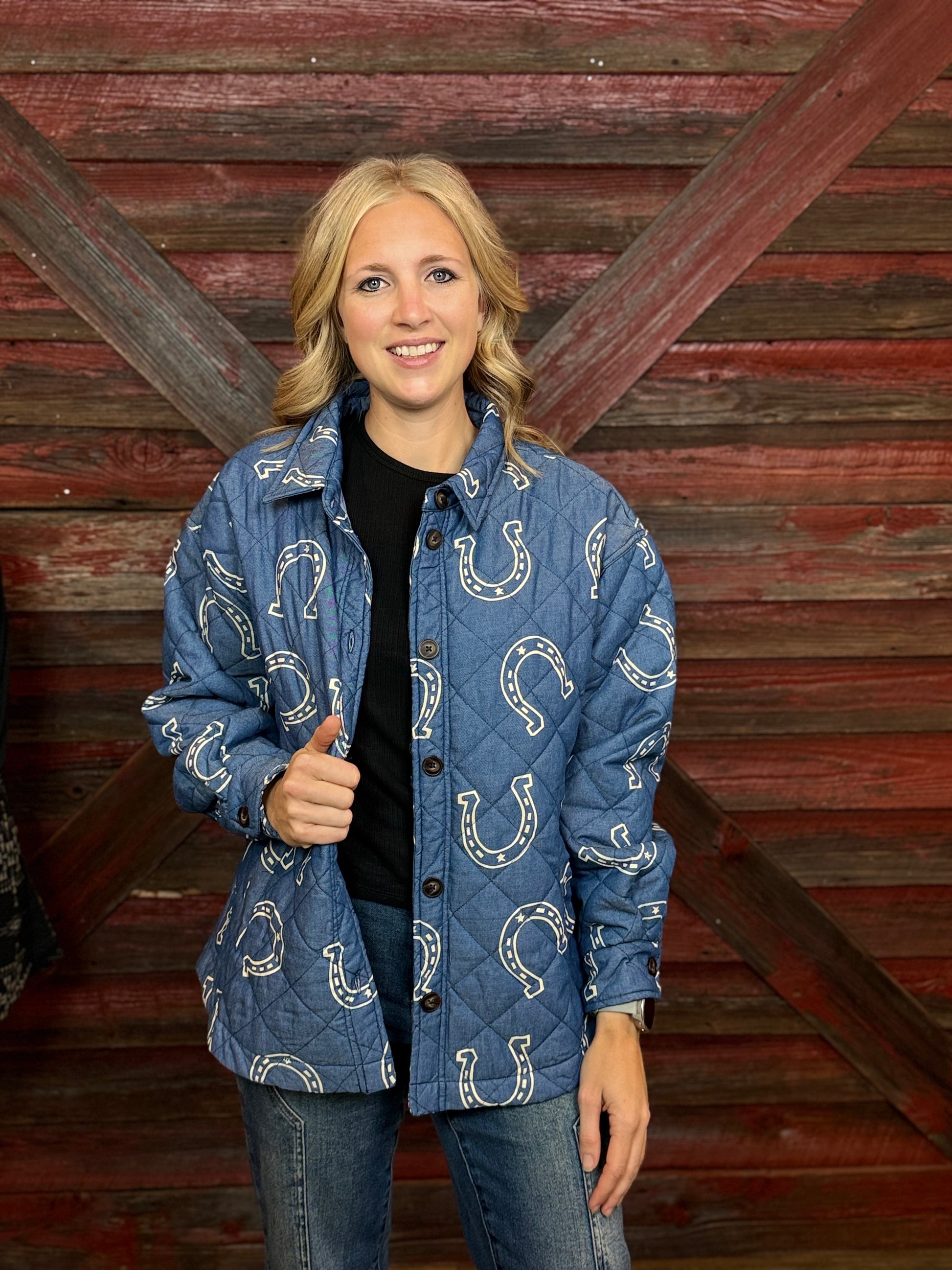 Blue Quilted Jacket, With White Printed Horse Shoes