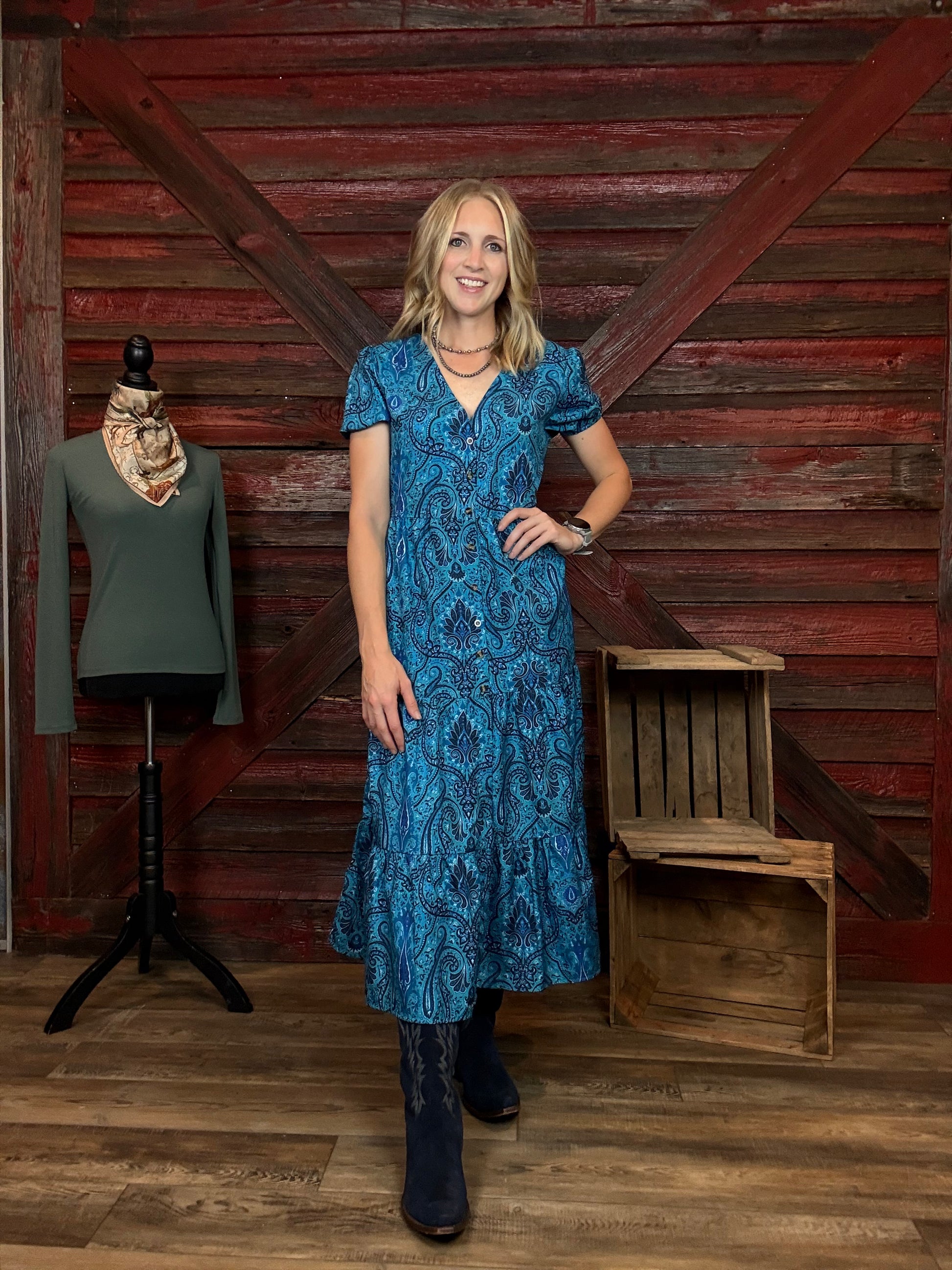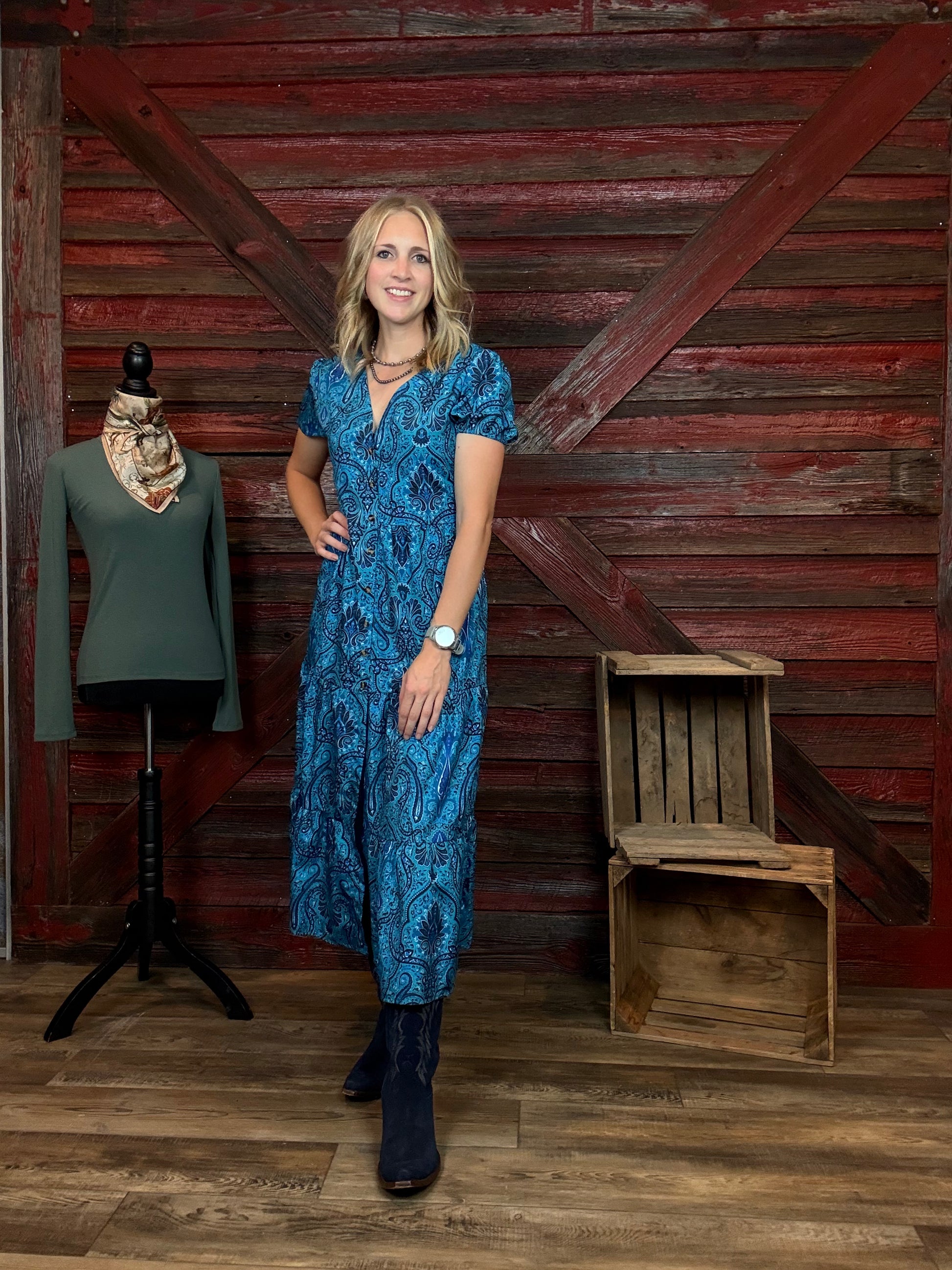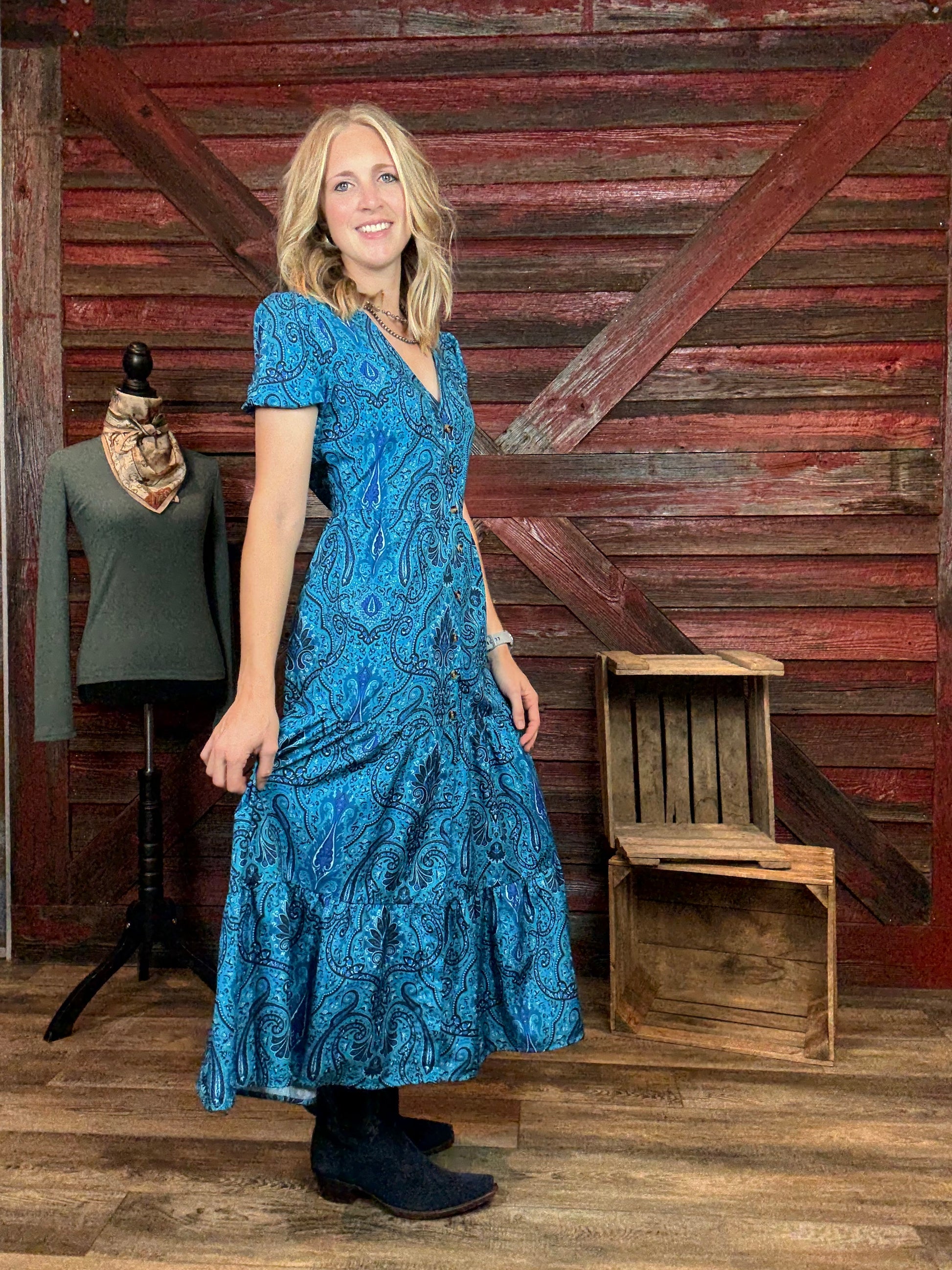 Blue Paisley Maxi Dress with Button Closure Down the Front.
