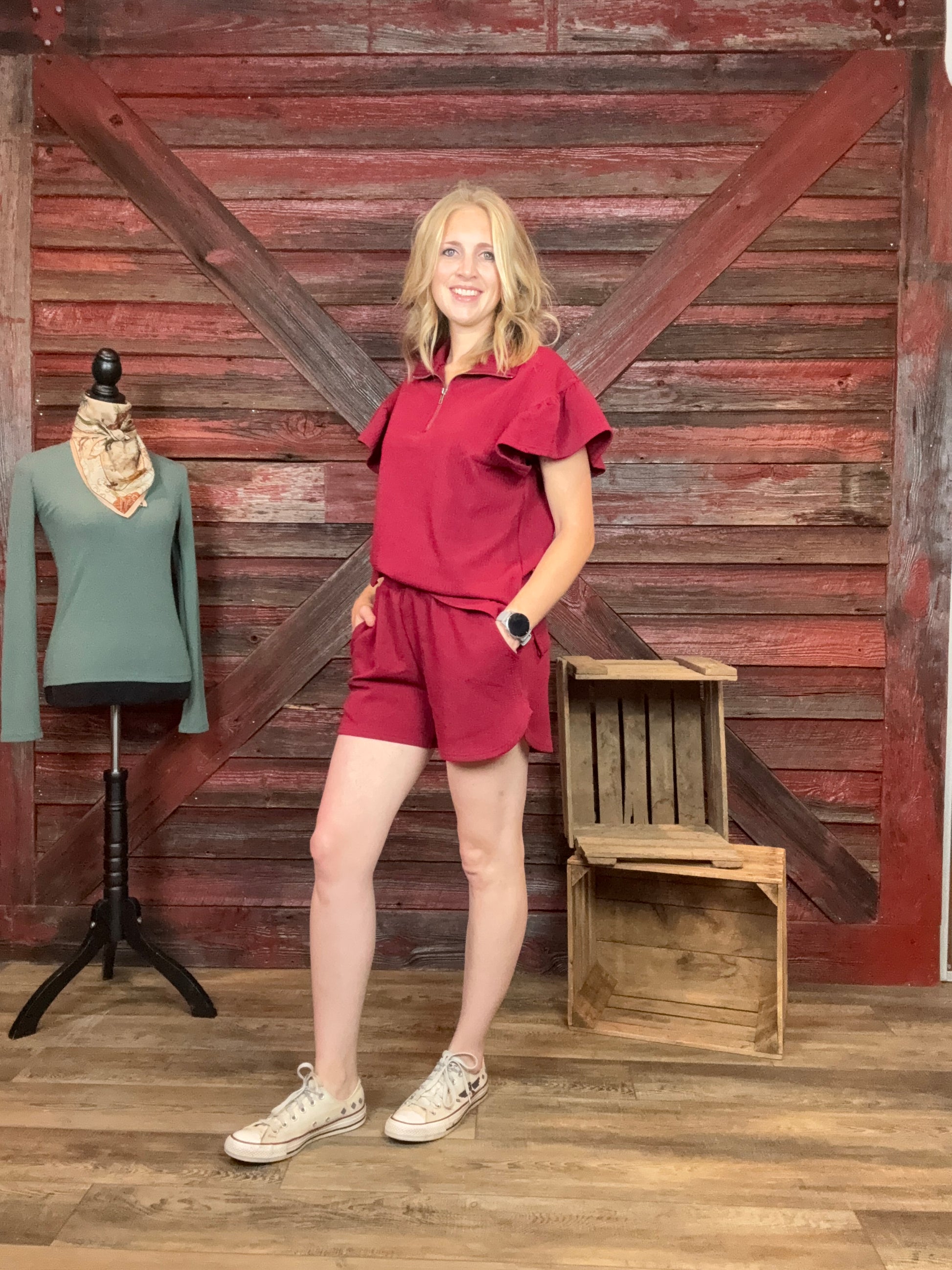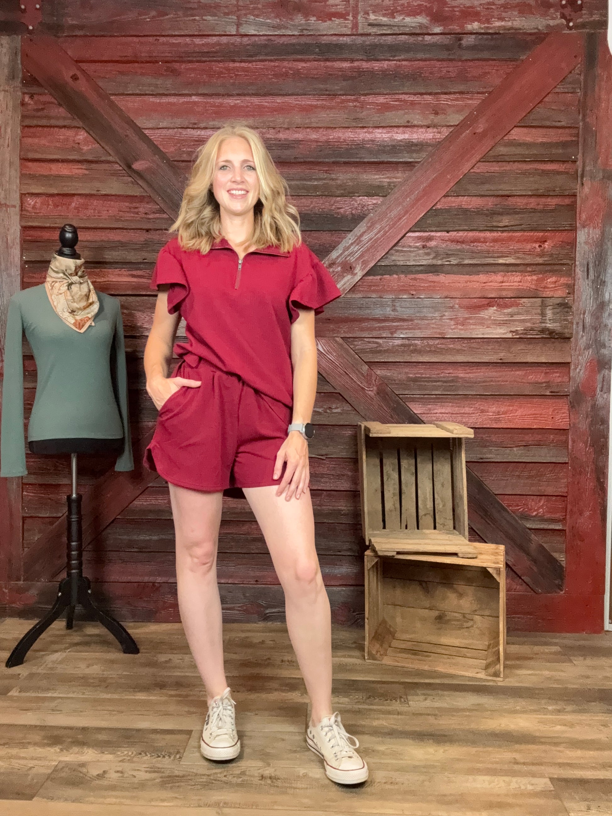 Elevated Athleisure Set. Maroon Ribbed Fabric, Flutter Sleeve, Collared, Quarter Zip. Shorts have true pockets.