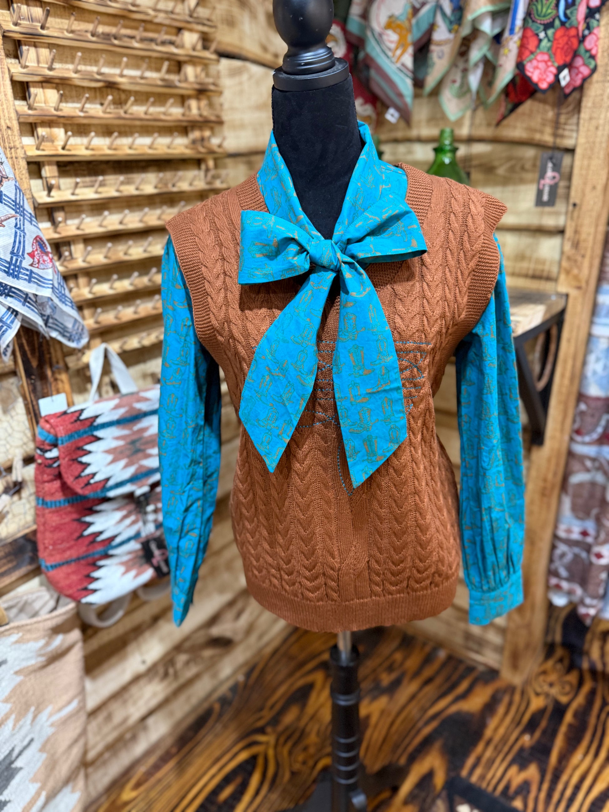 Teal with brown boots pattern, finished with a bow.