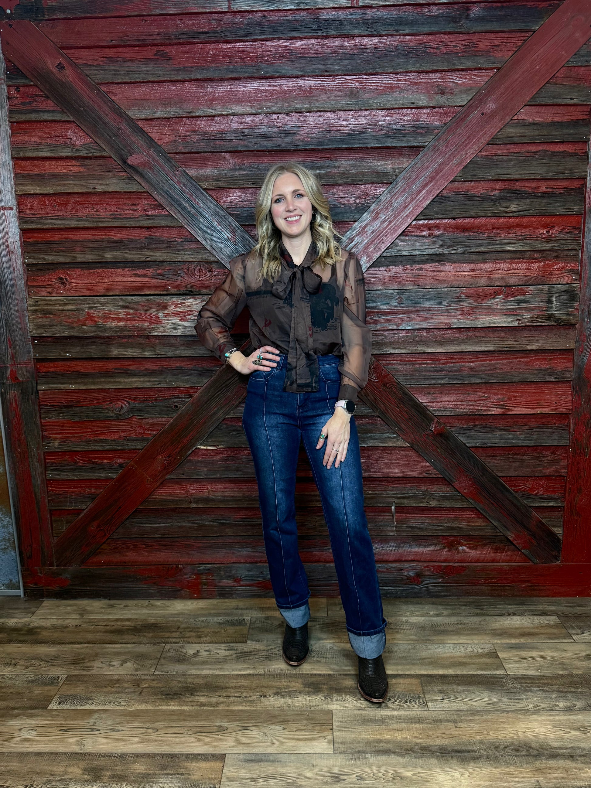 Toile made western. A neutral sheer button down with a pop of red, bow, and western graphic