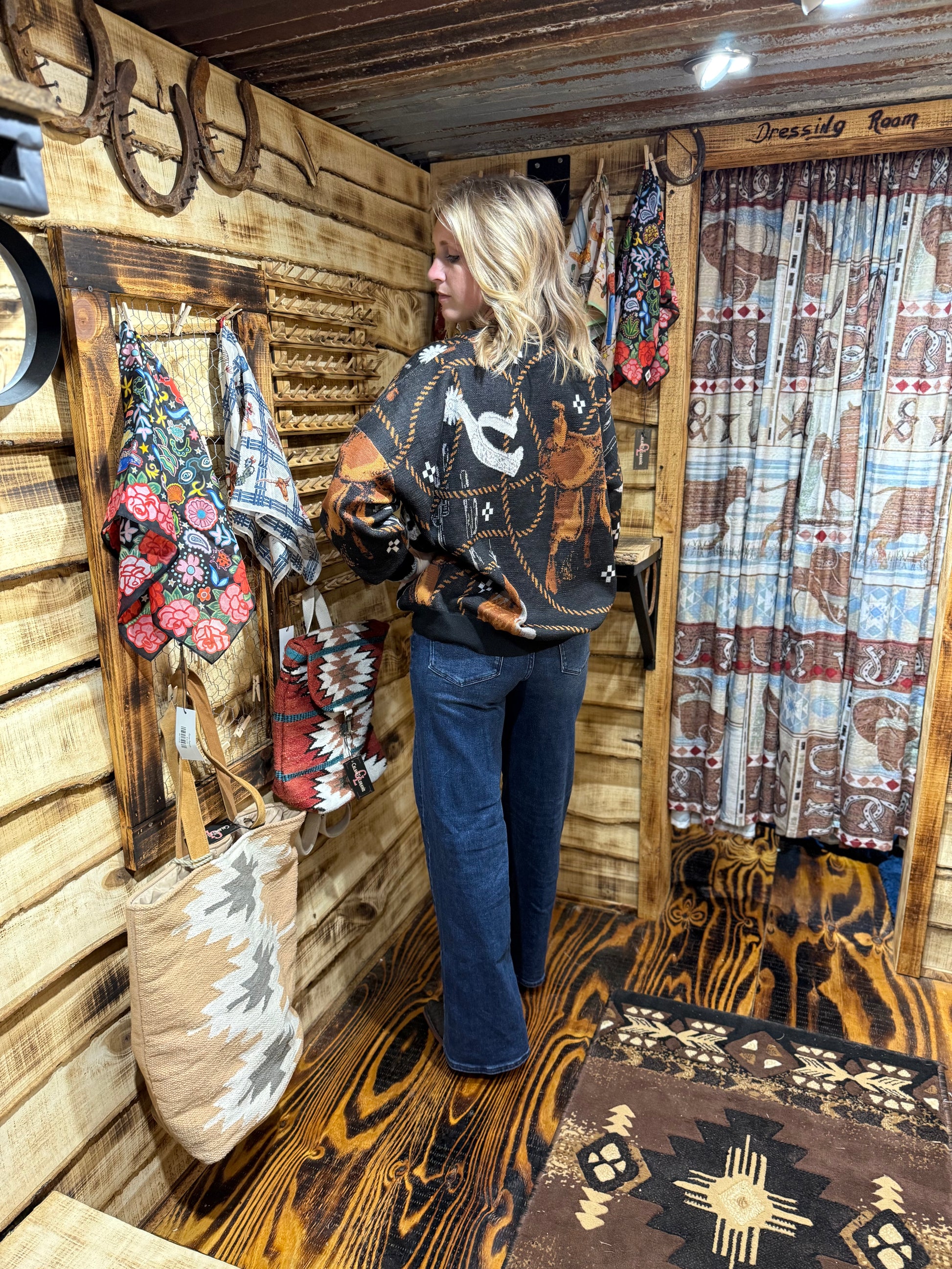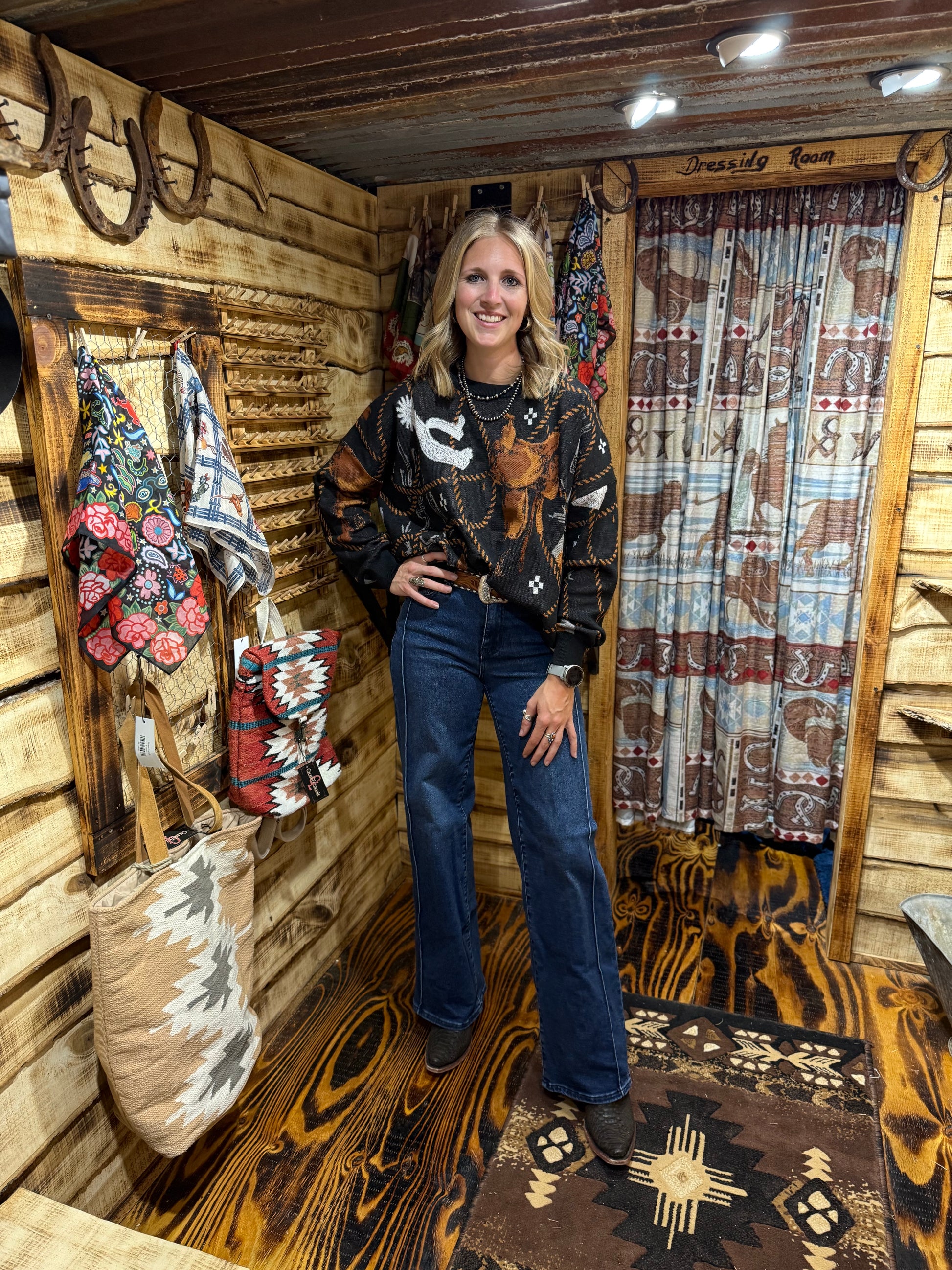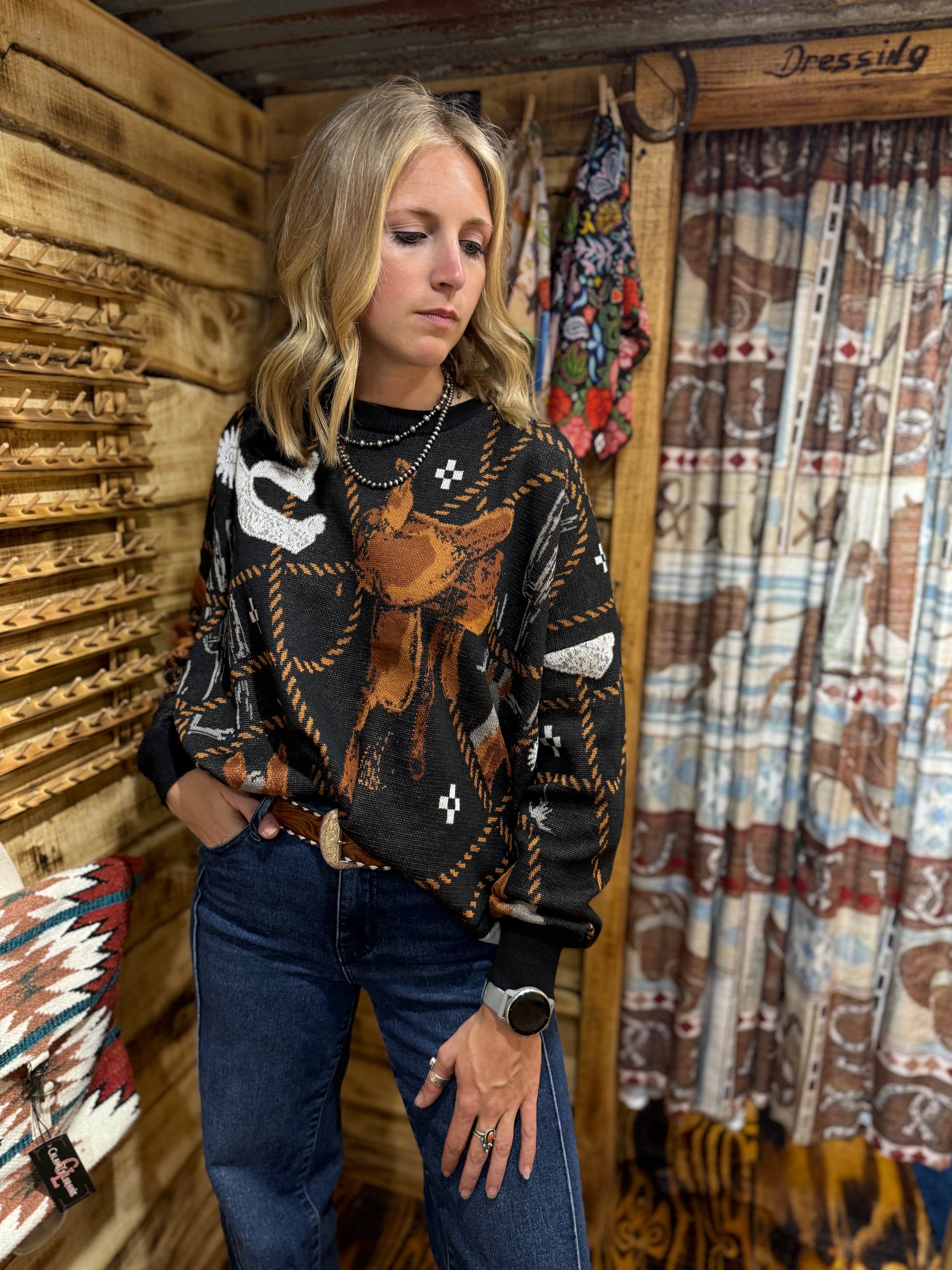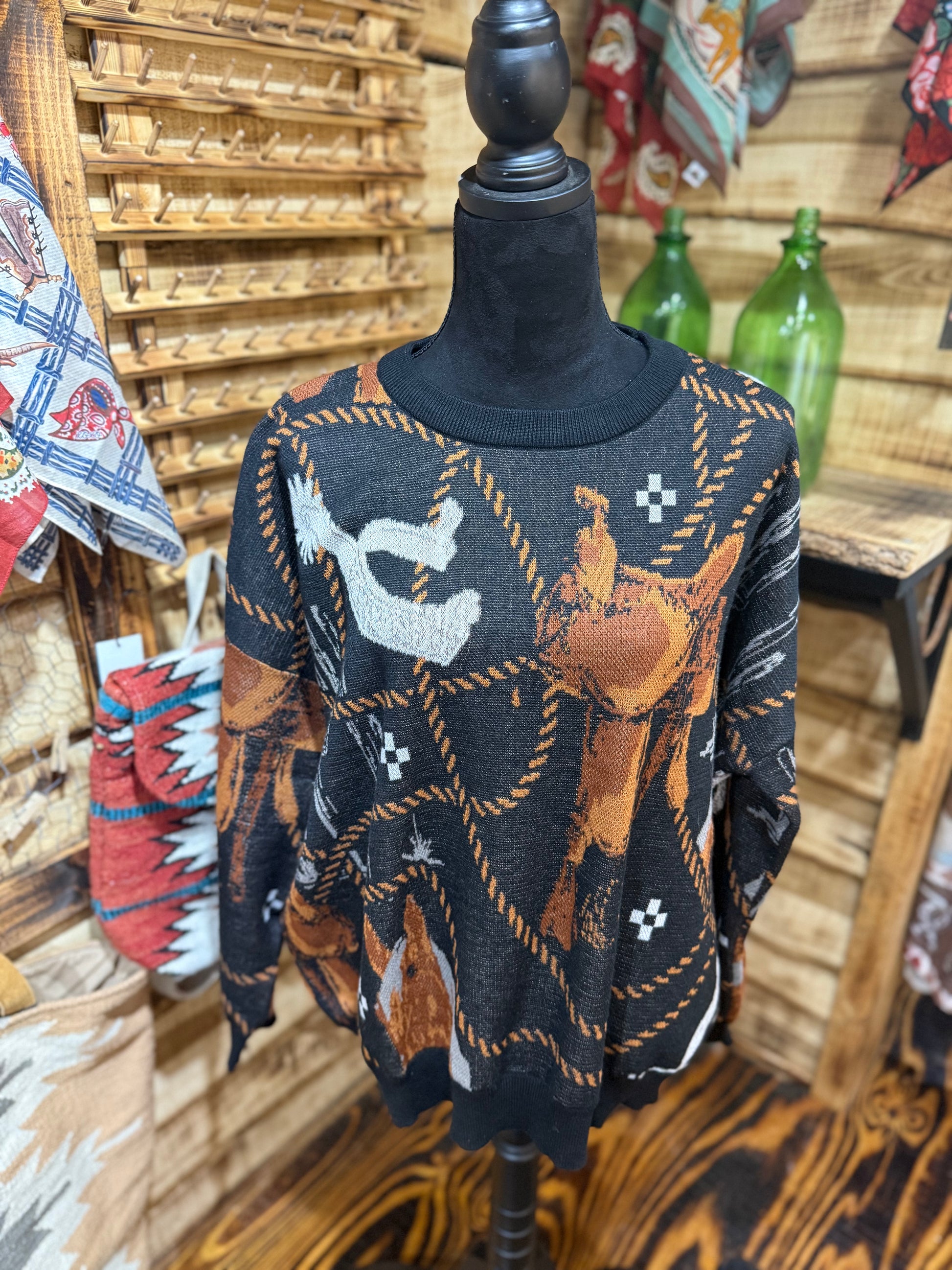 An oversized knit sweater with equestrian tack items spread throughout the pattern