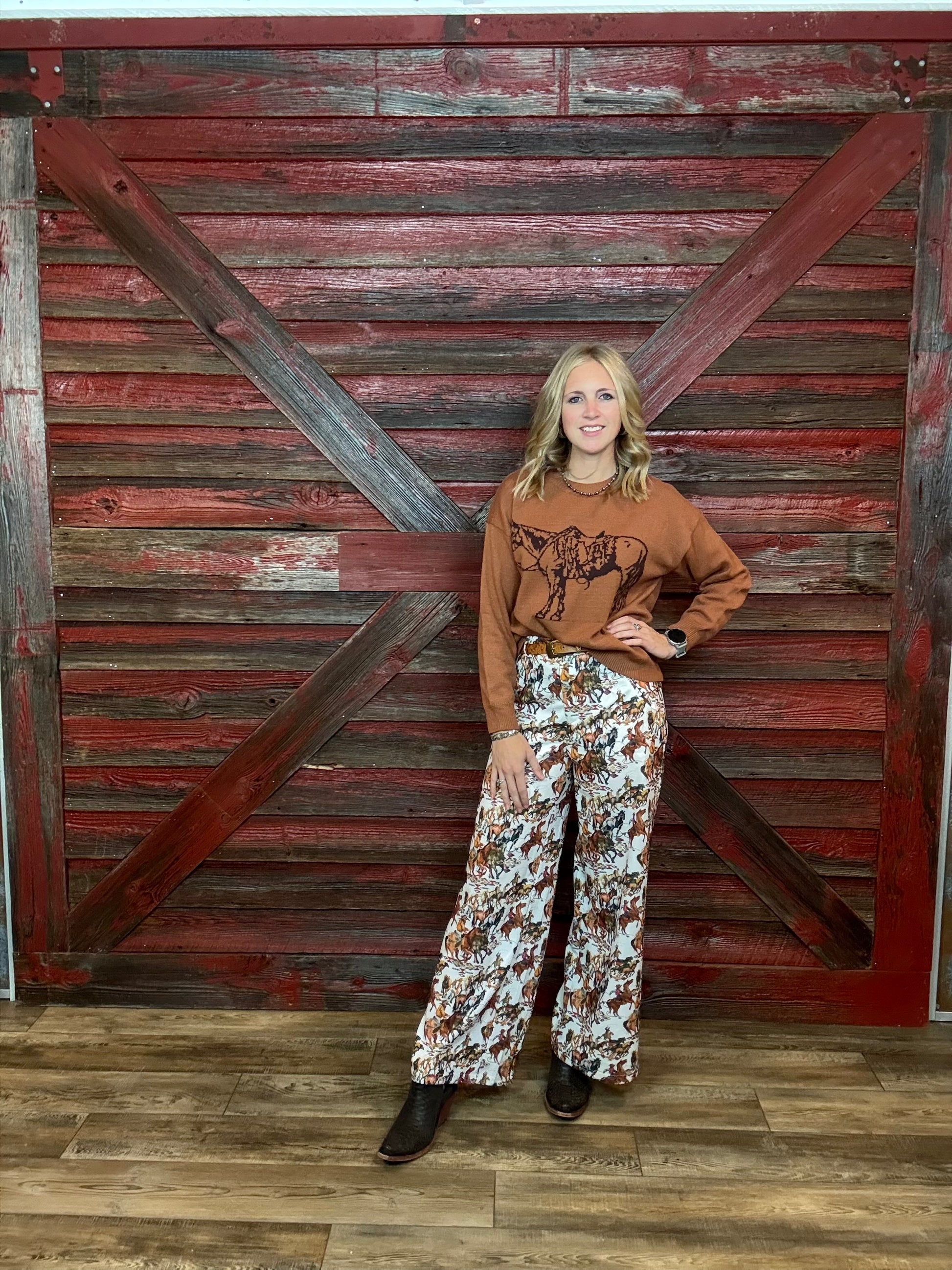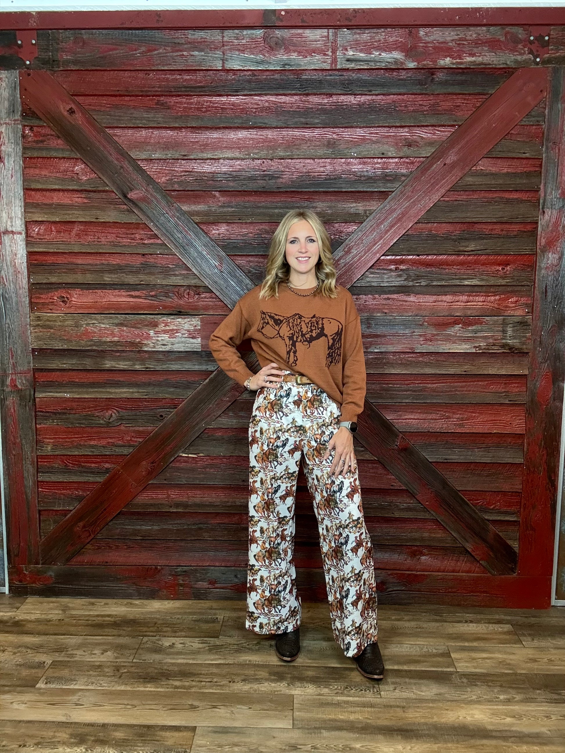 Crewneck Sweater with Chocolate Brown Cowpony design