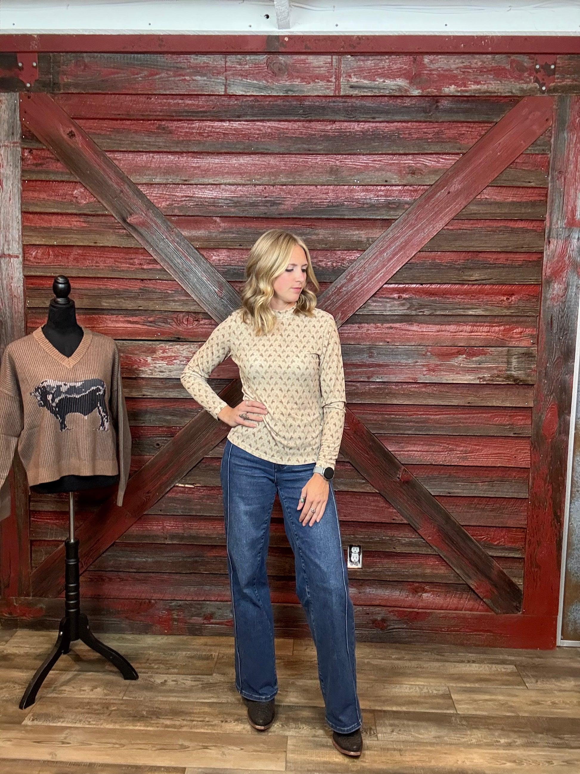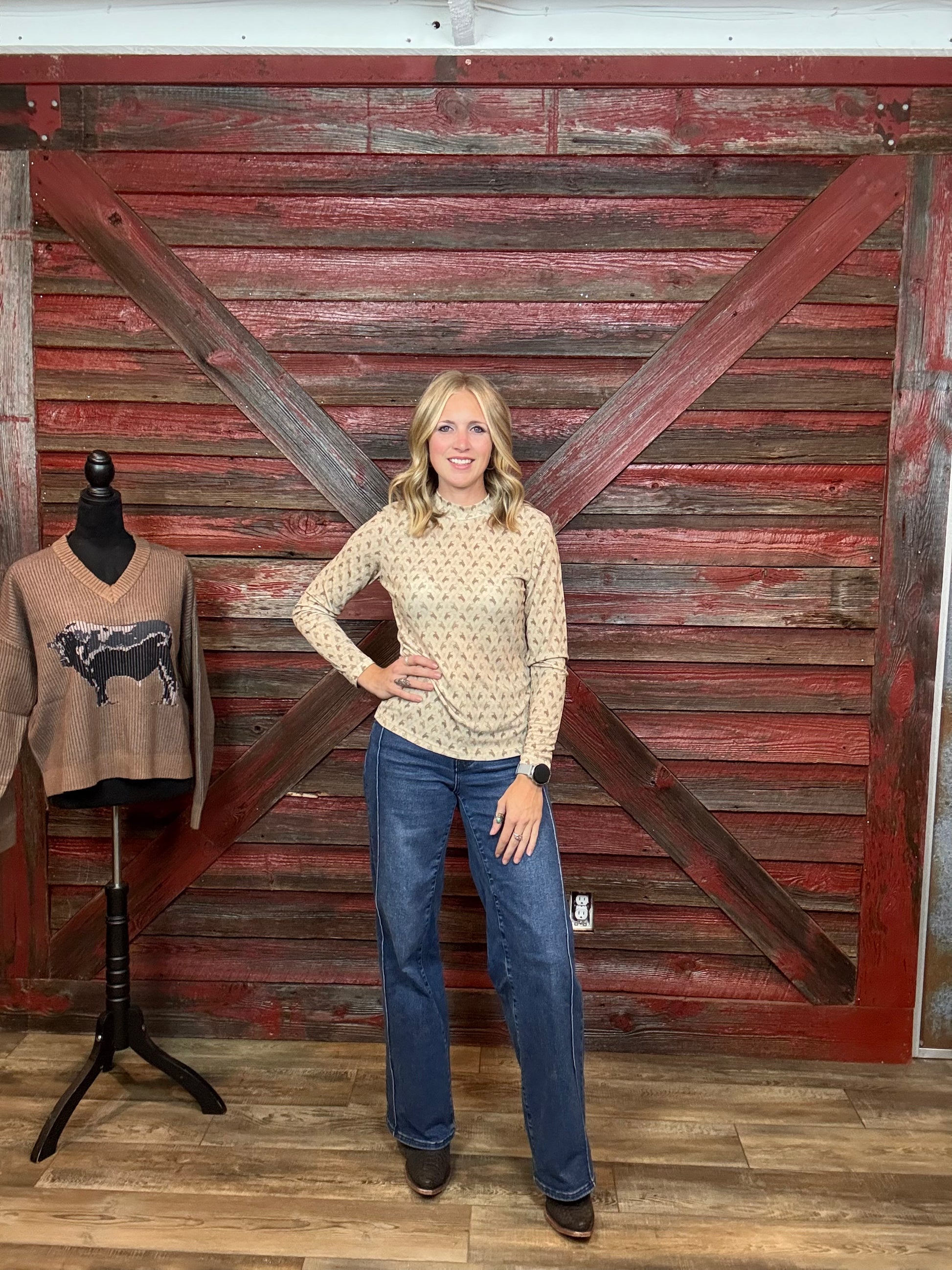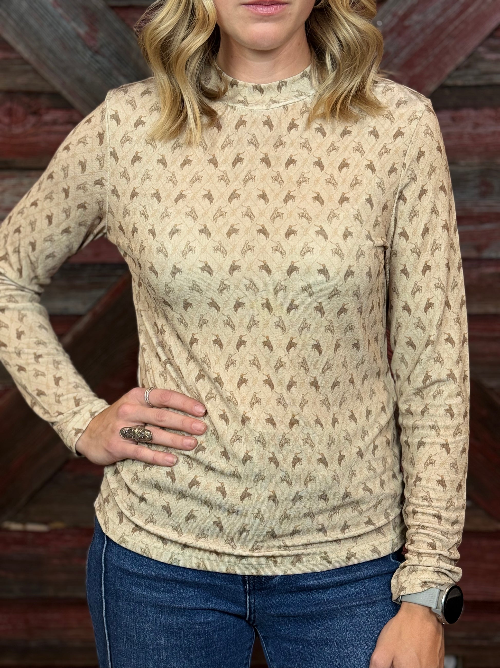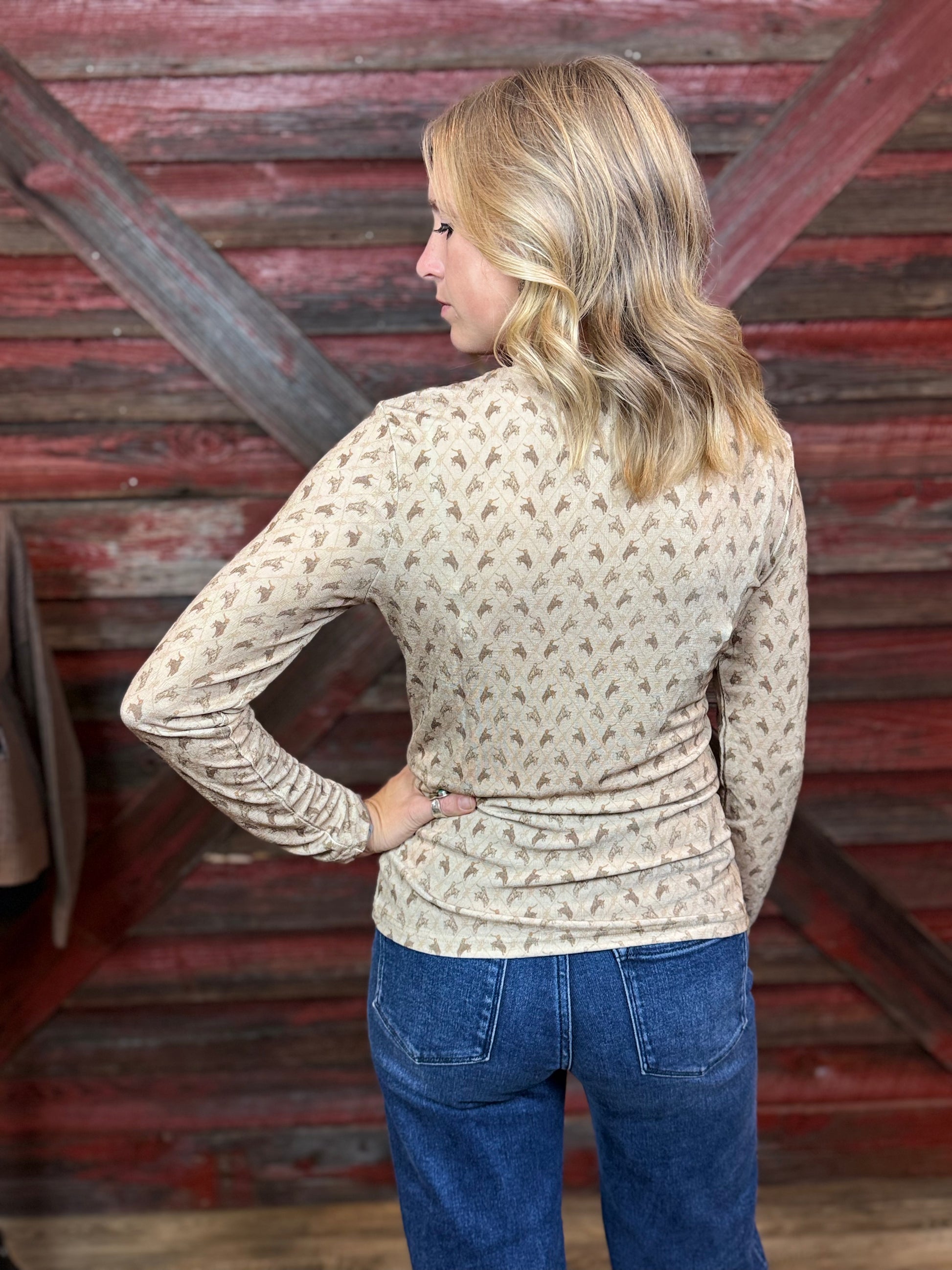 The petite subtle bucking bronc pattern brings a western vibe to a simple long sleeve.