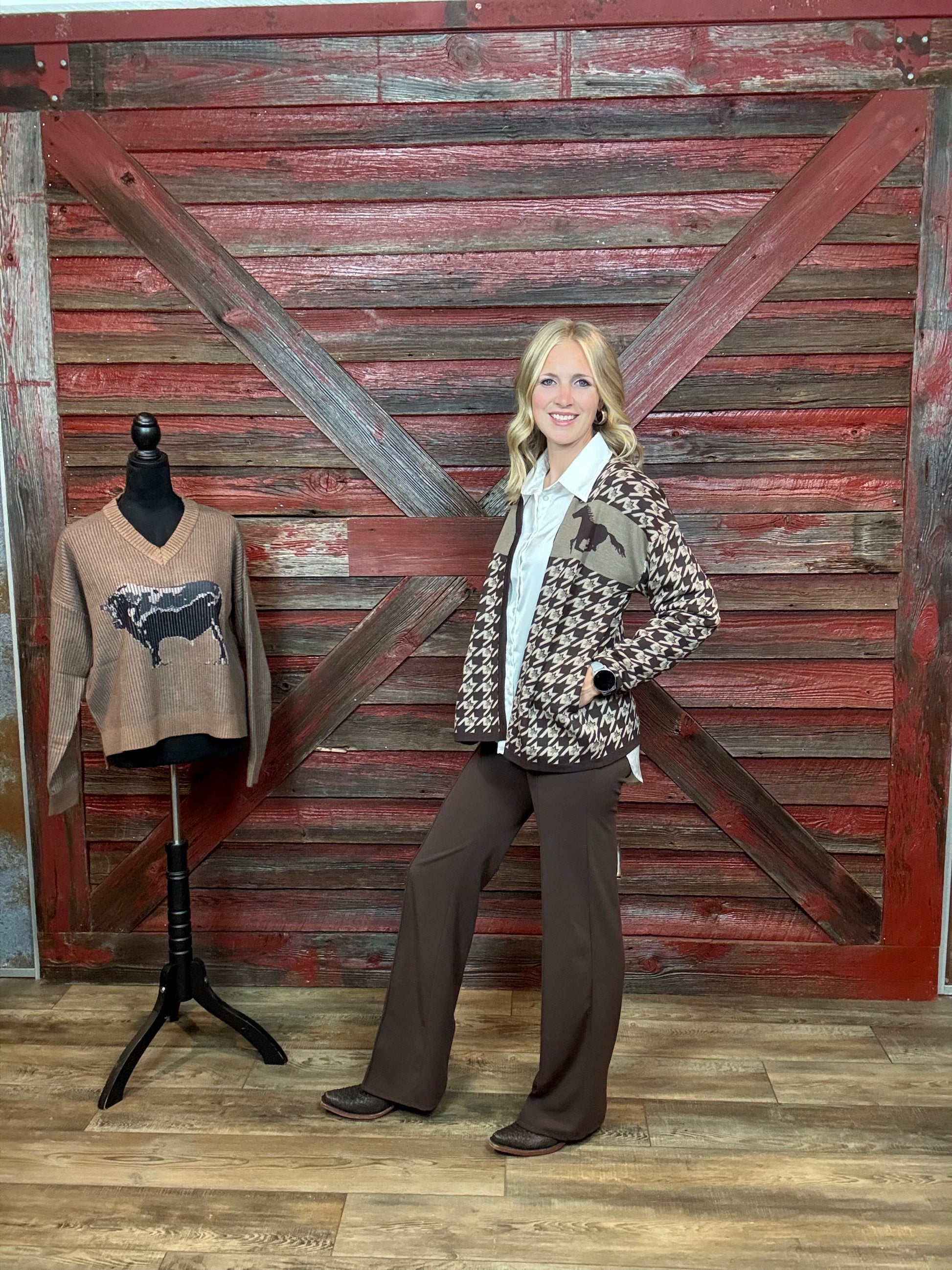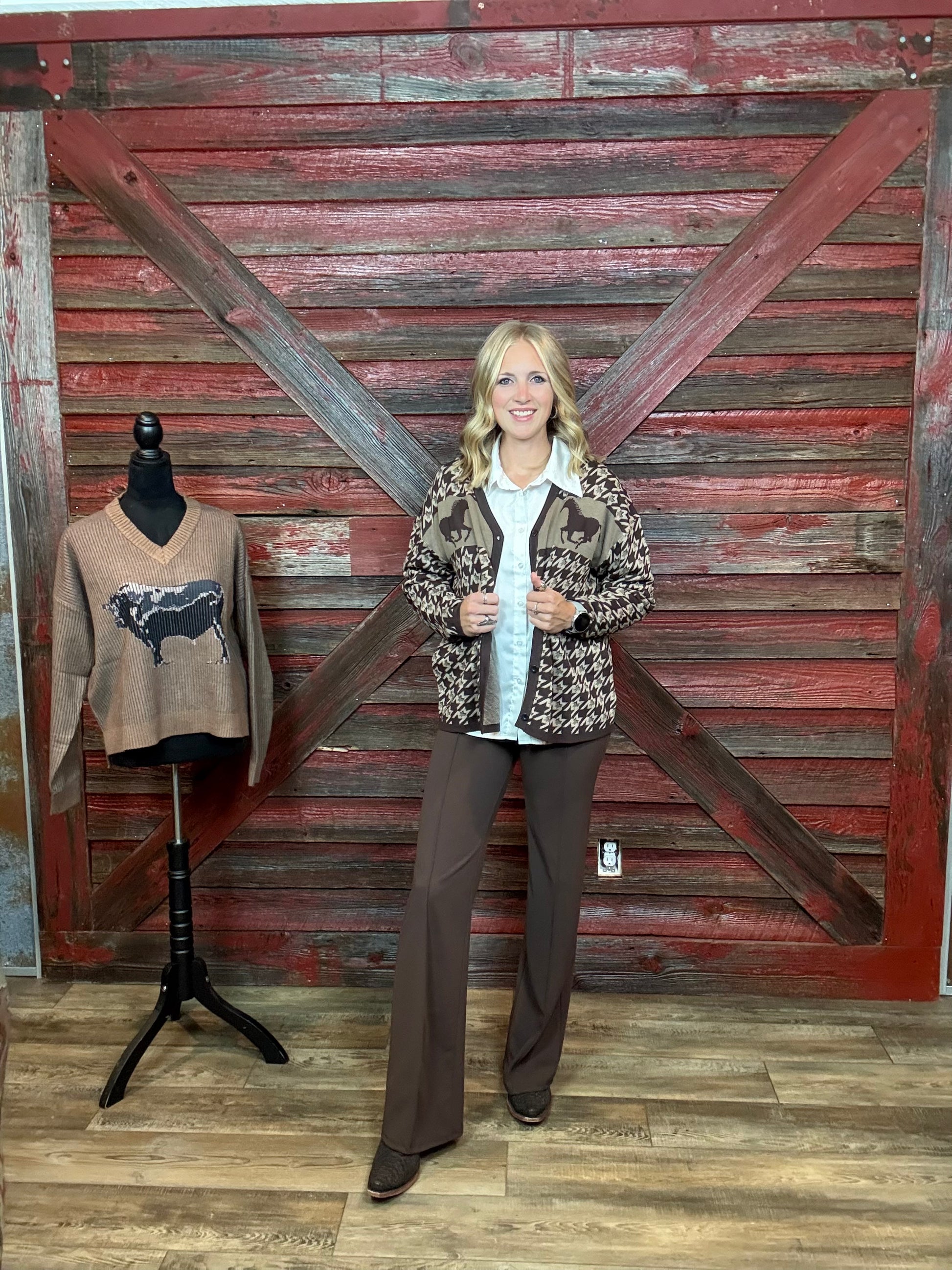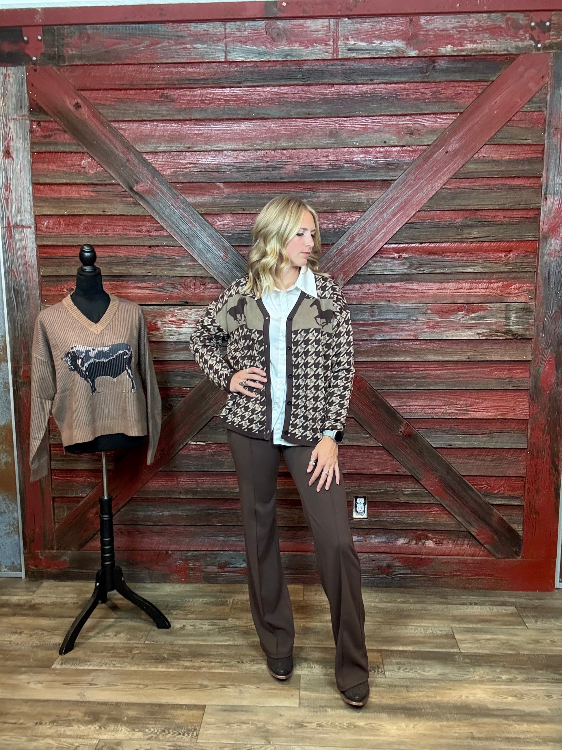 Brown Houndstooth Button Down Cardigan, Finished with Pockets
