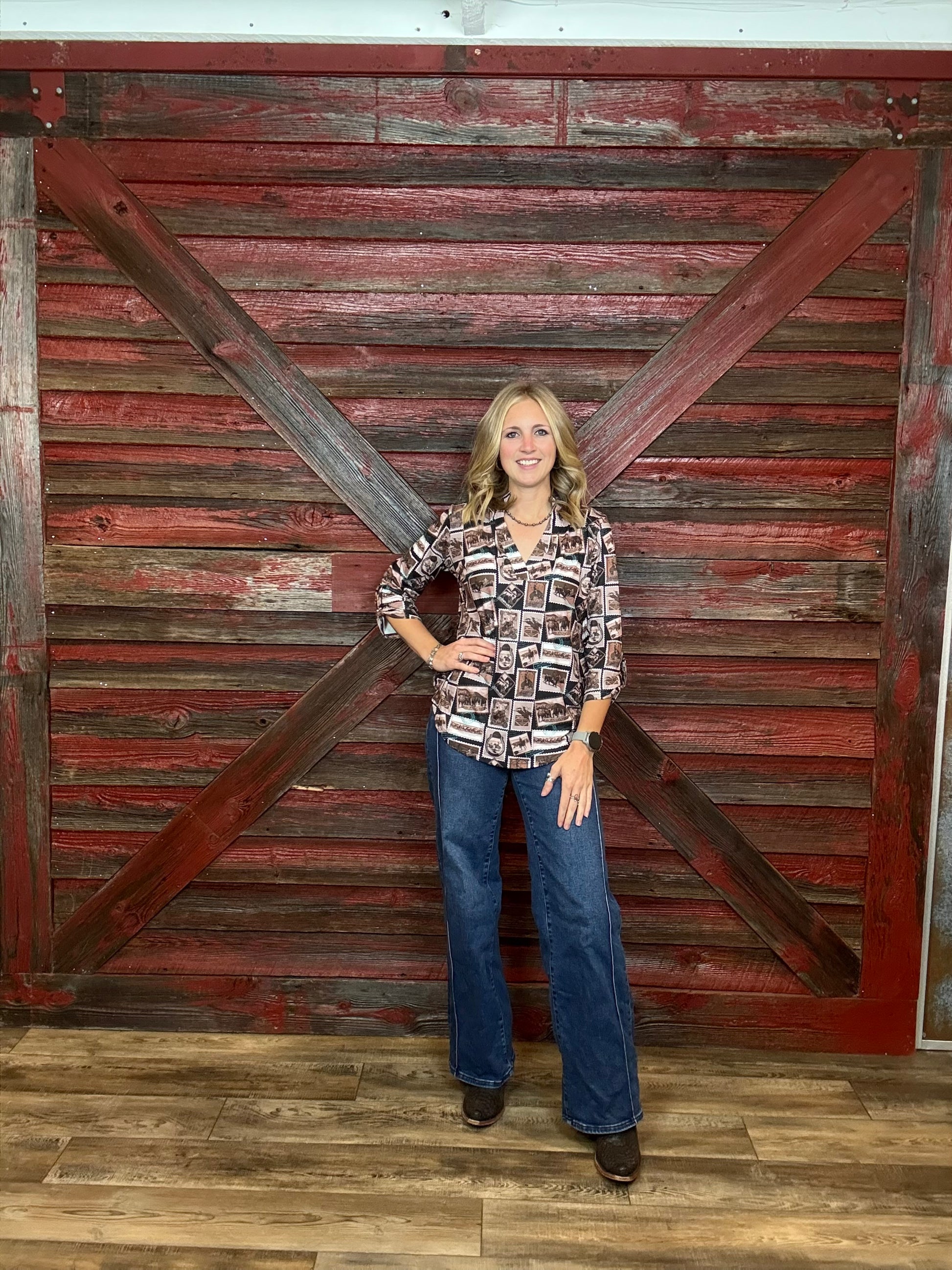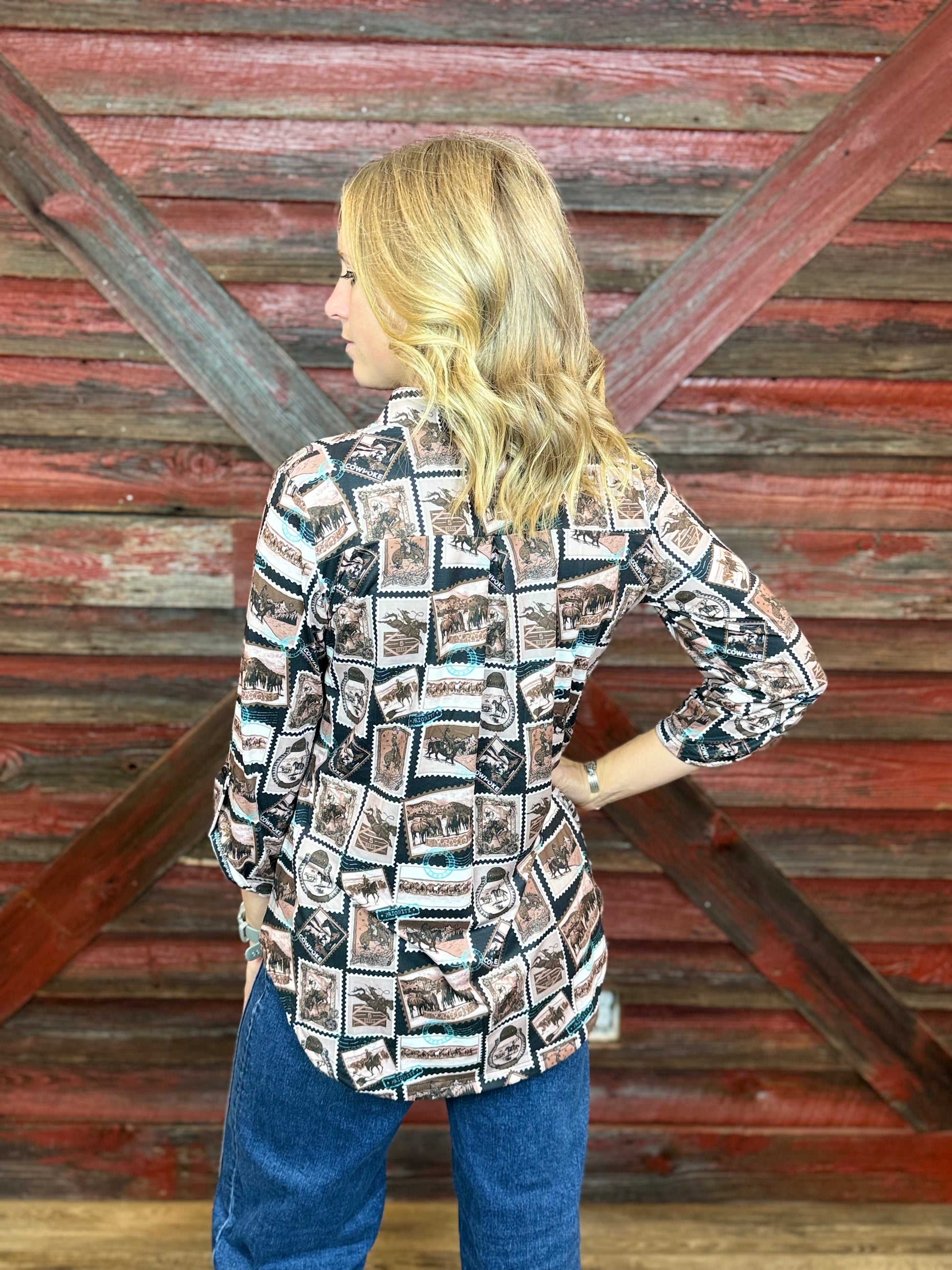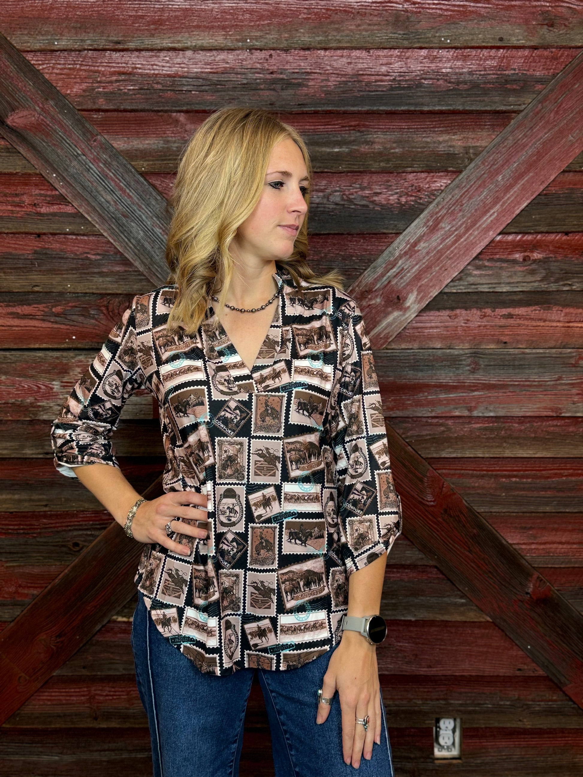 A Curvy Cut 3/4 sleeve Blouse, Western Postcard Style Print